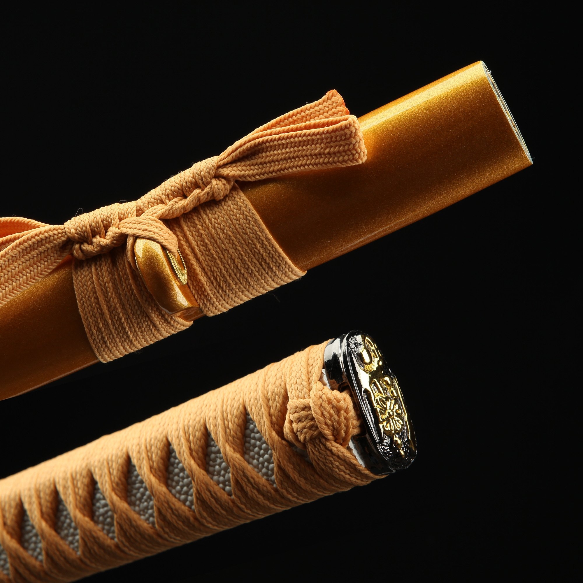 - Gold hardwood scabbard with high quality piano paint finish, gold cord and ray skin wrap