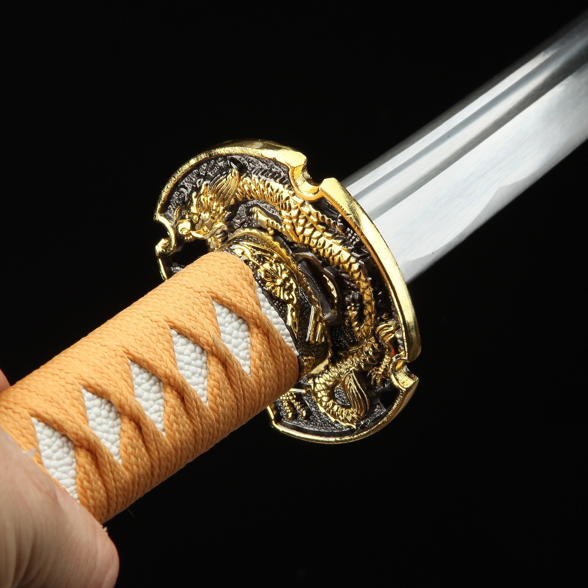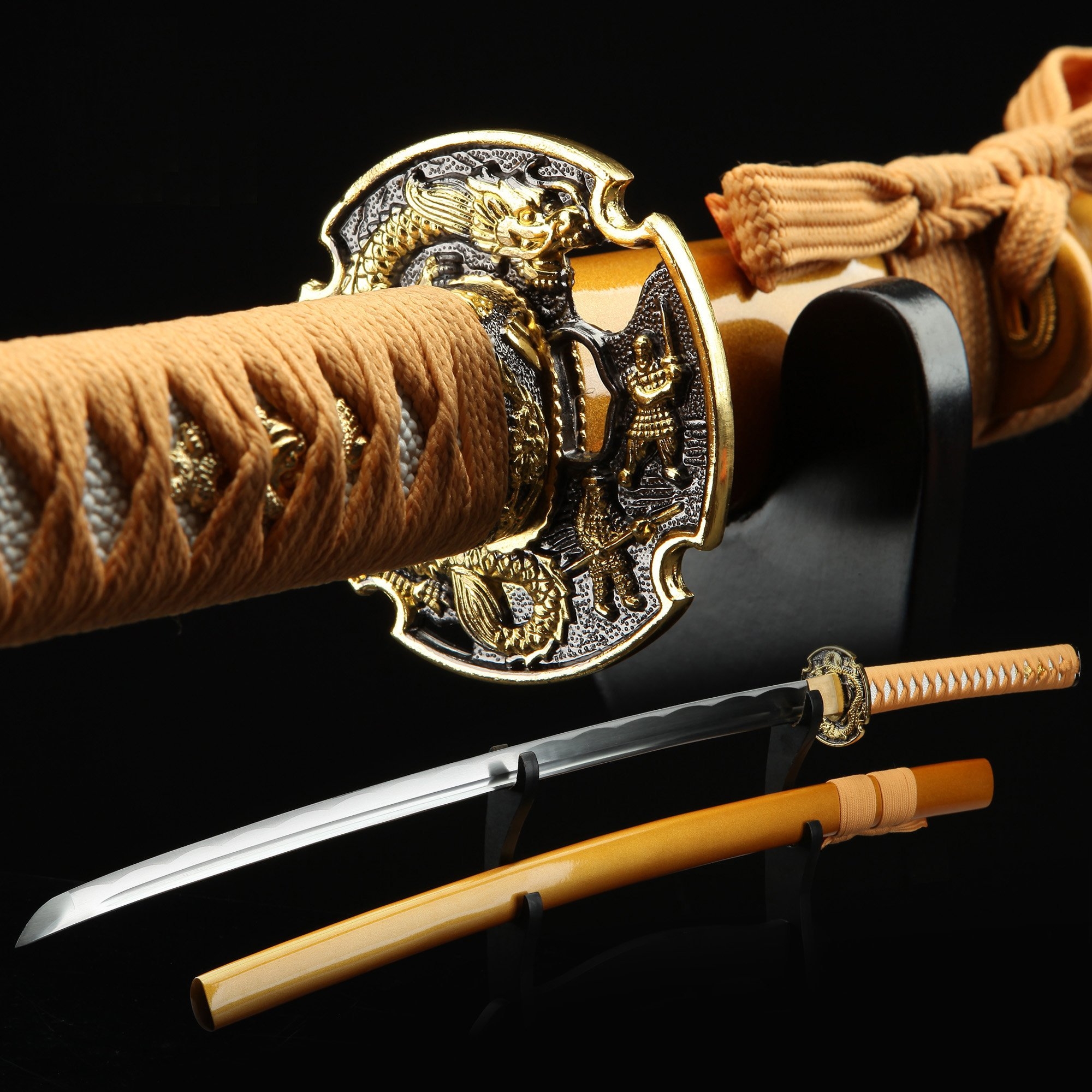 - Overall length: 40.5 inches, nagasa length: 28.3 inches, handle length: 10.2 inches, tsuba style: gold dragon, blade sharp: sharpened, blade material: 1045 carbon steel, blade width: 1.18 inches, saya material: wood, weight: 2.45 lbs