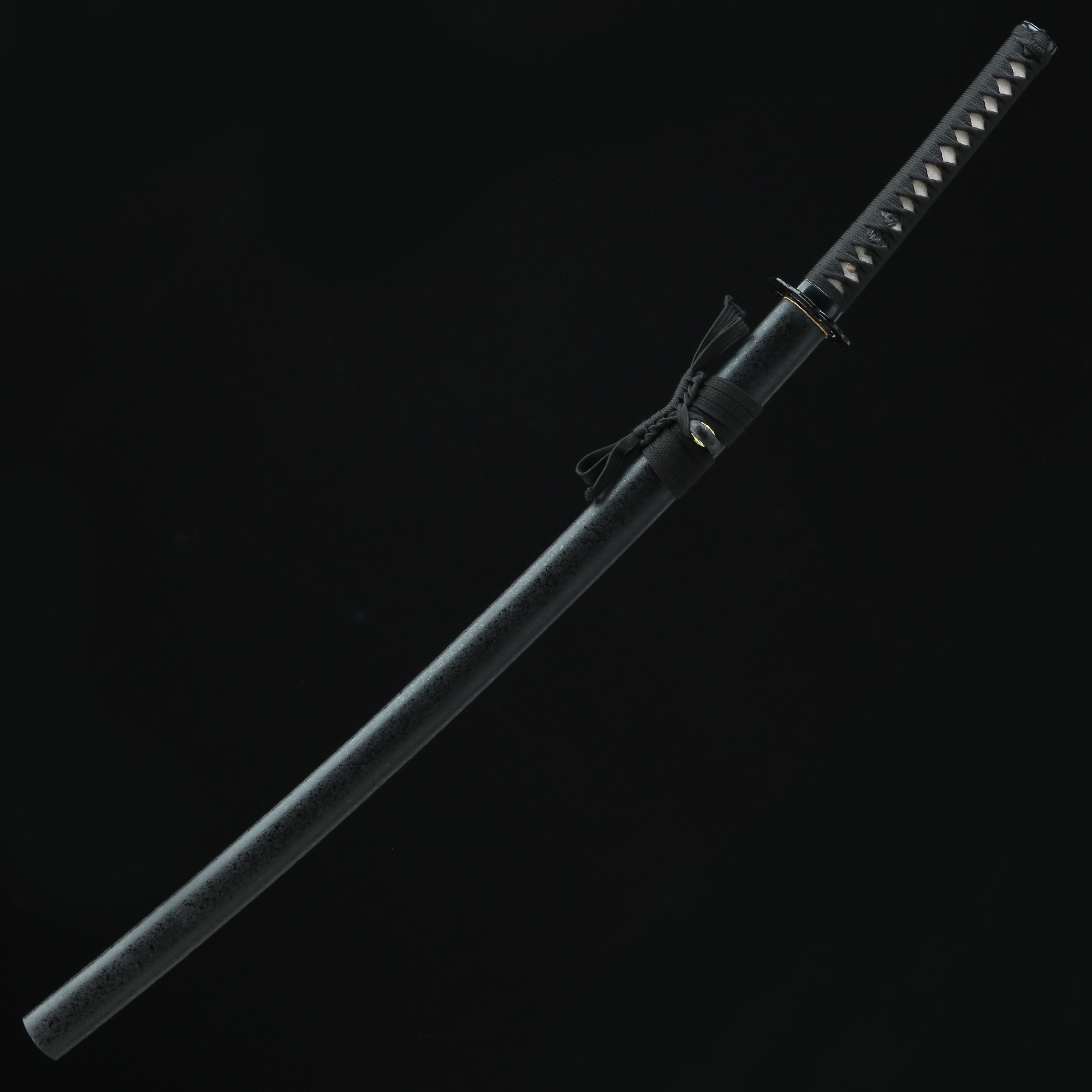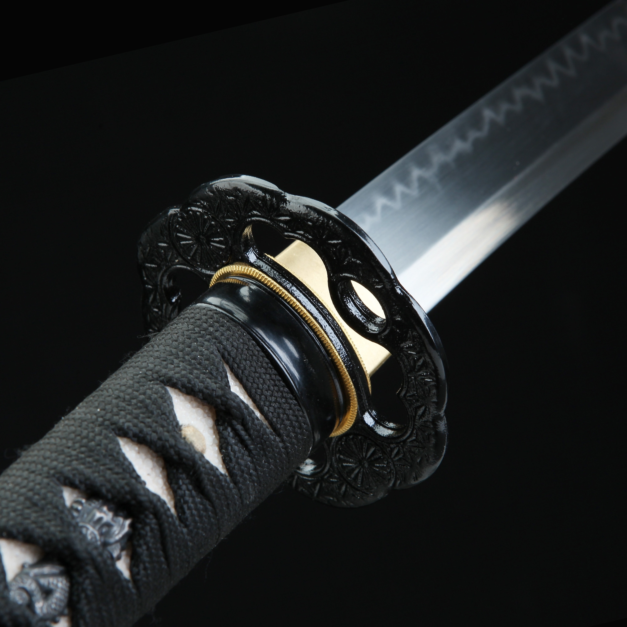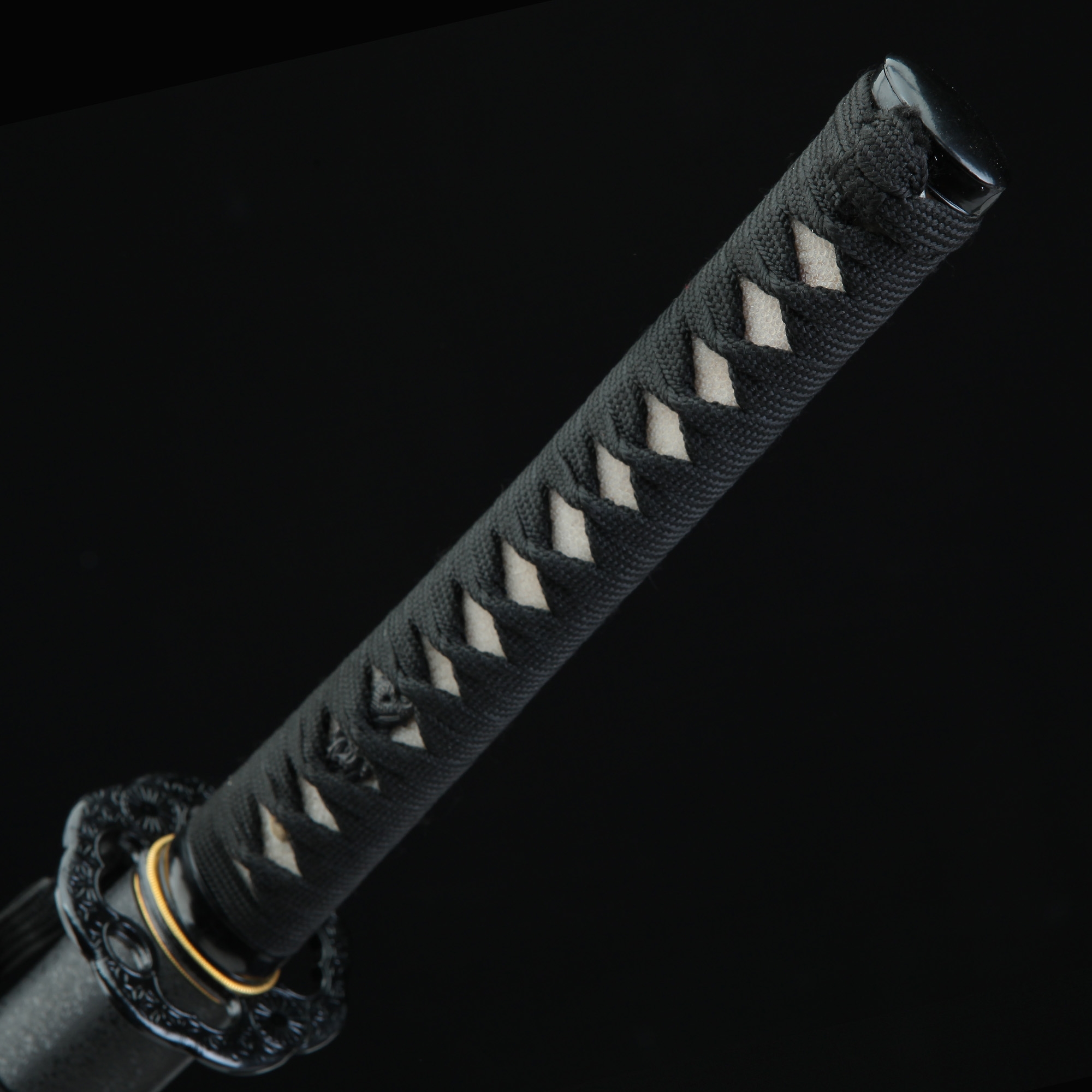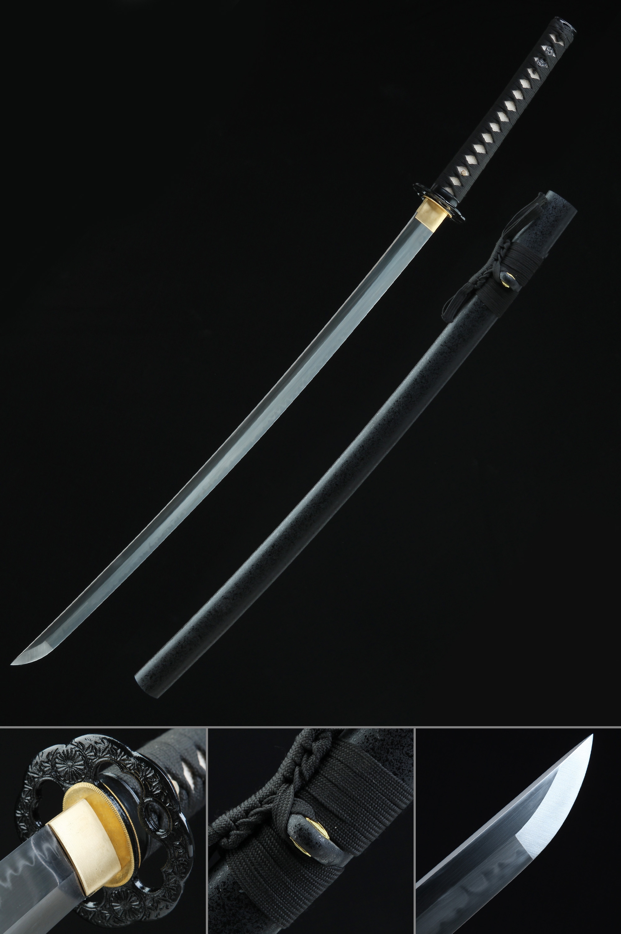 - Black katana, t10 carbon steel, clay tempered, real hamon, handmade, full tang, battle ready, sharpened, 40.5 inches, 28 inches blade, black cord handle, balck scabbard