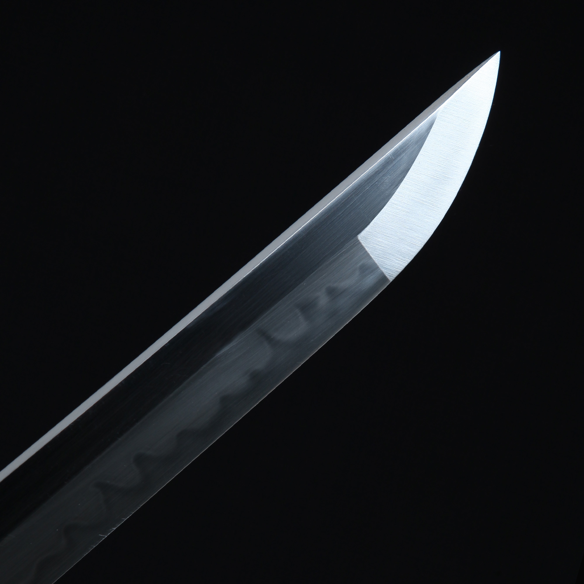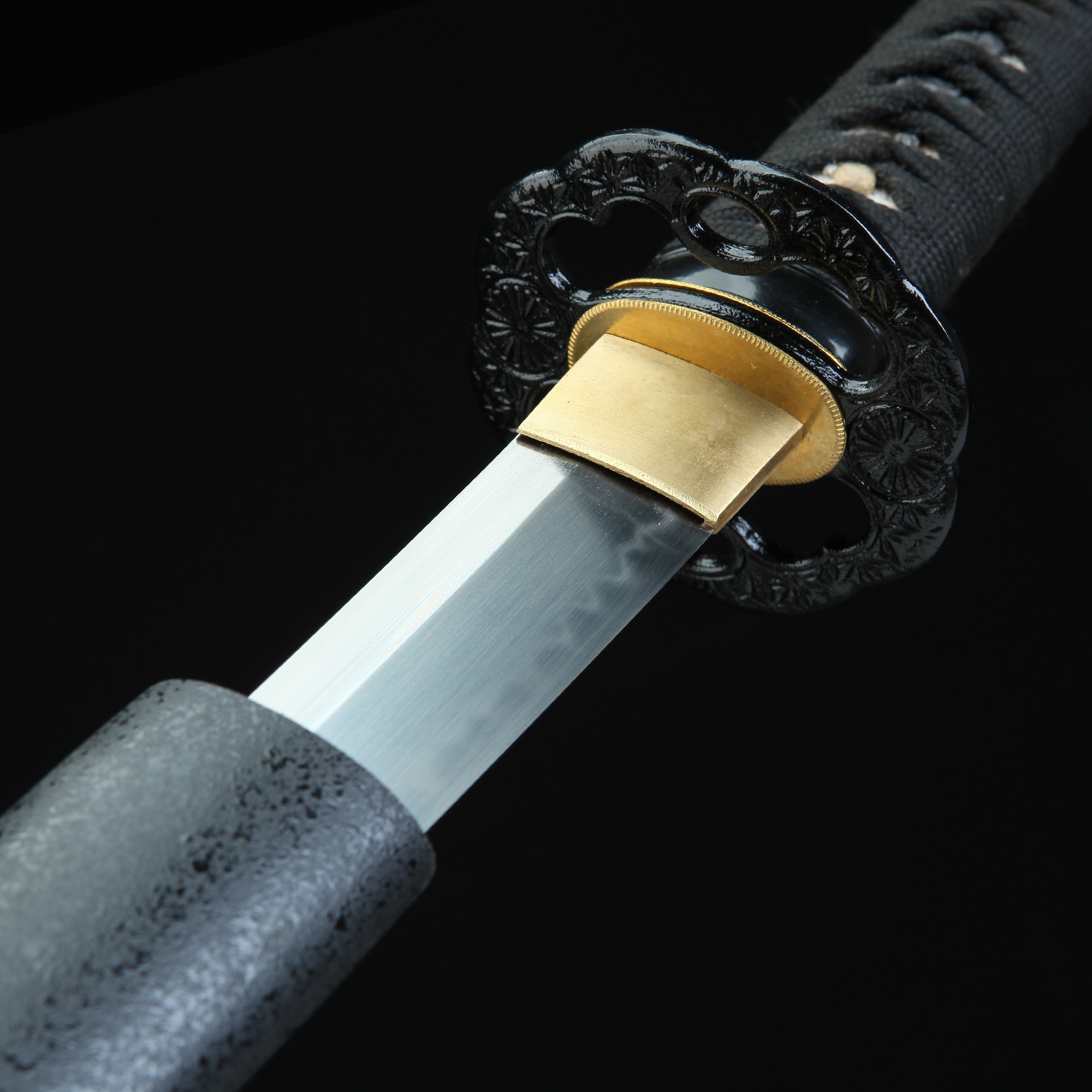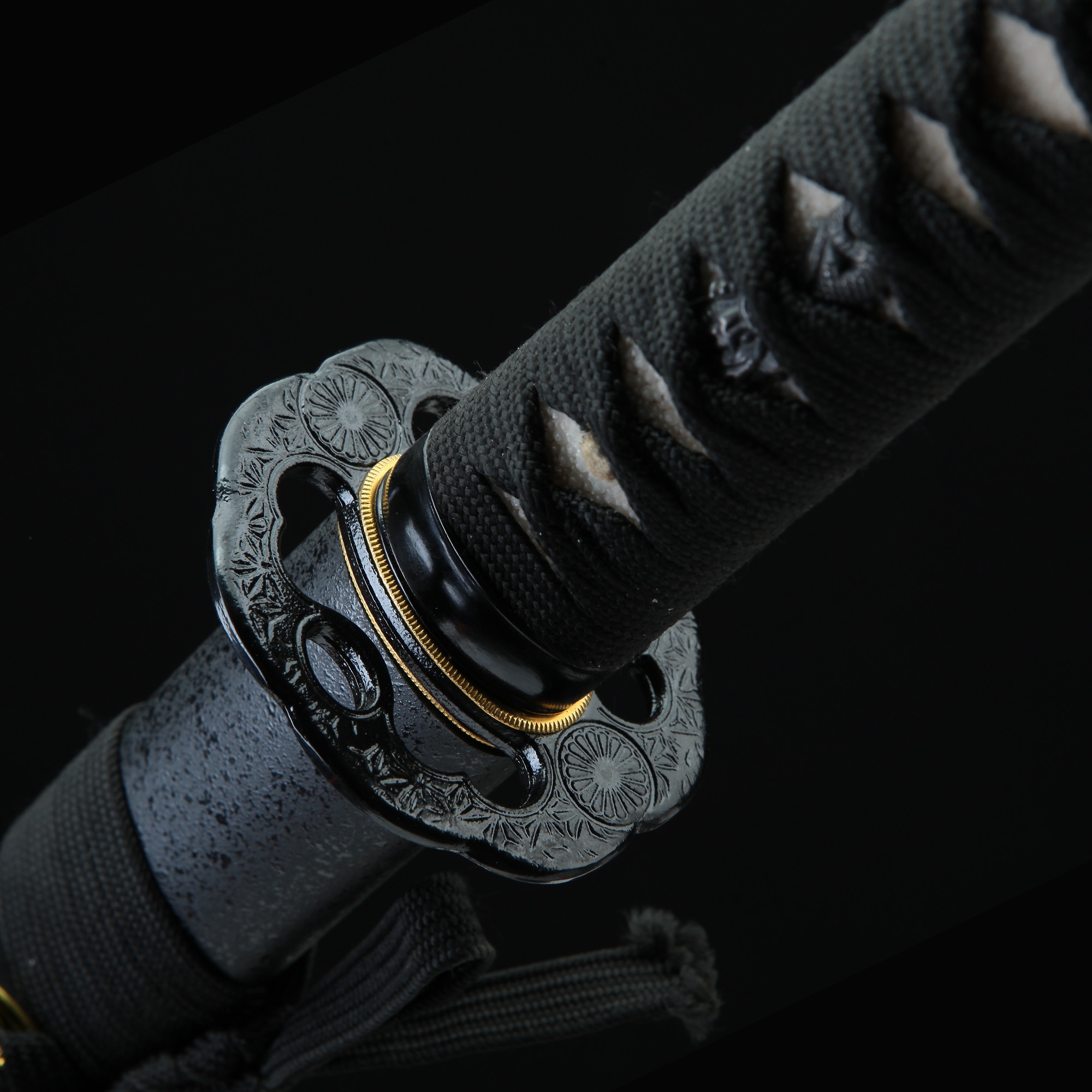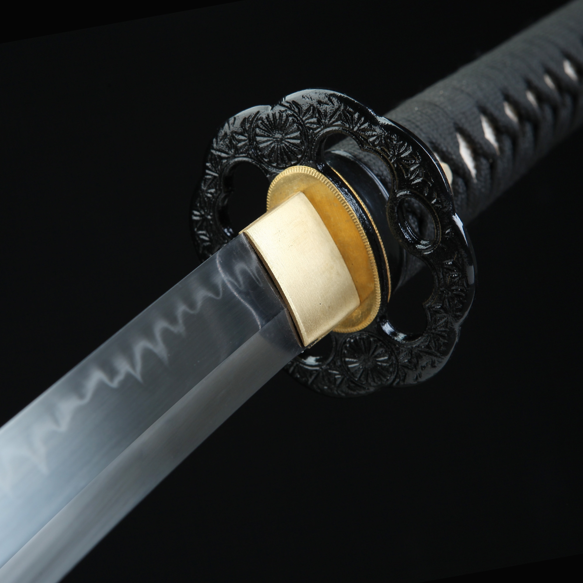- Black katana, t10 carbon steel, clay tempered, real hamon, handmade, full tang, battle ready, sharpened, 40.5 inches, 28 inches blade, black cord handle, balck scabbard