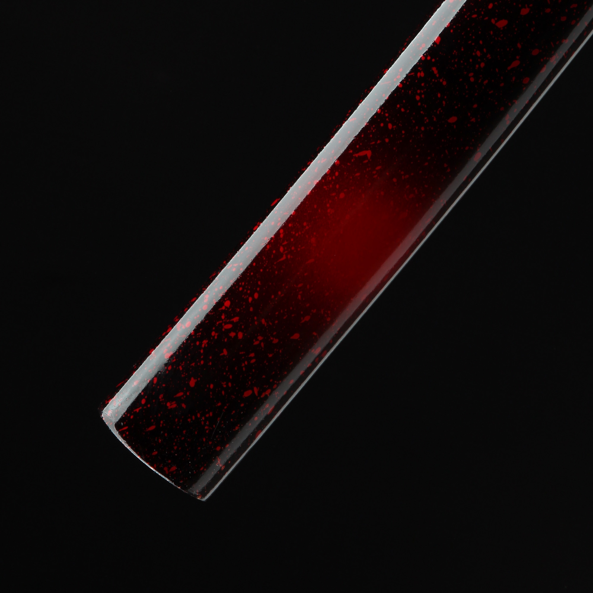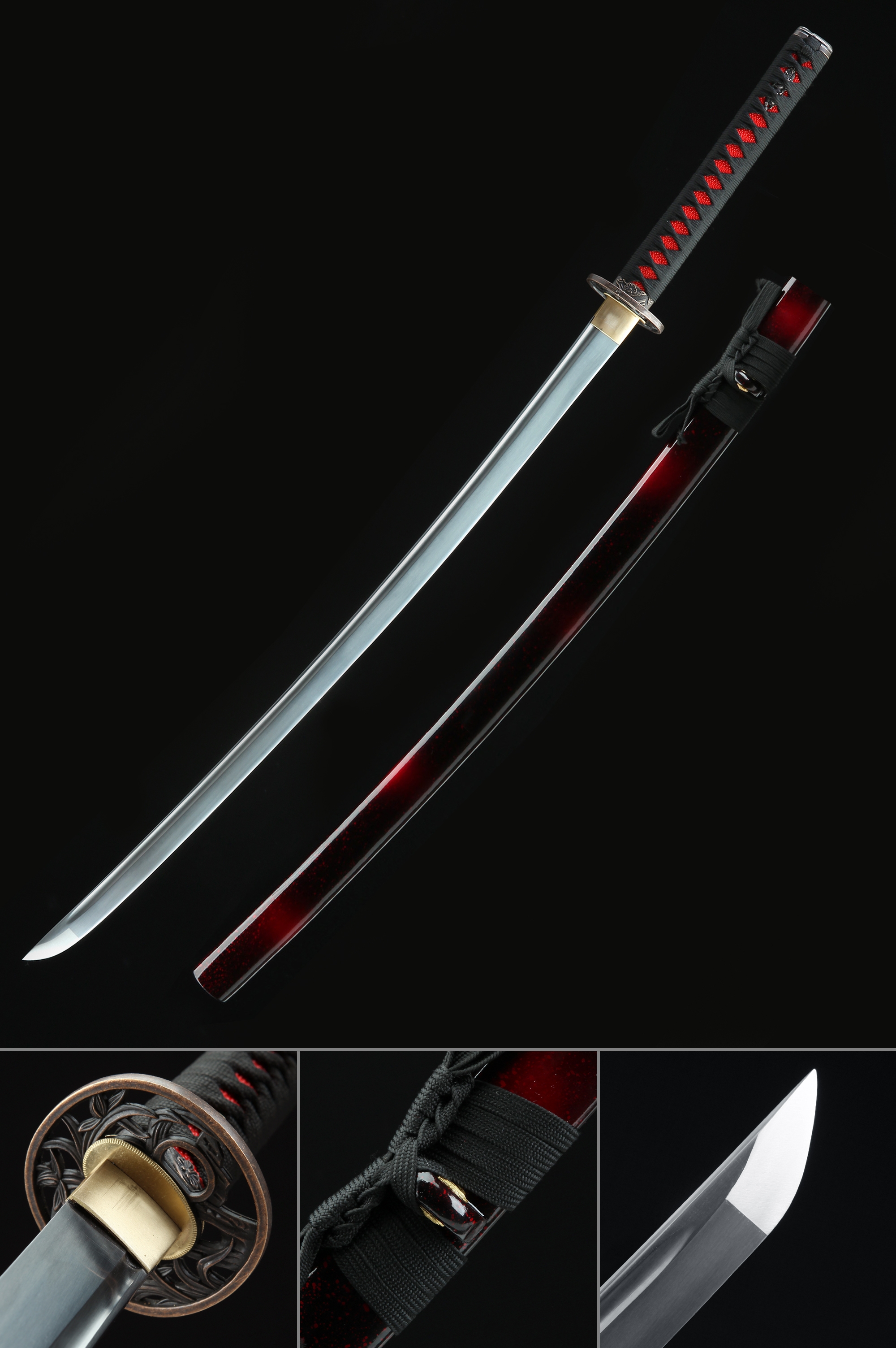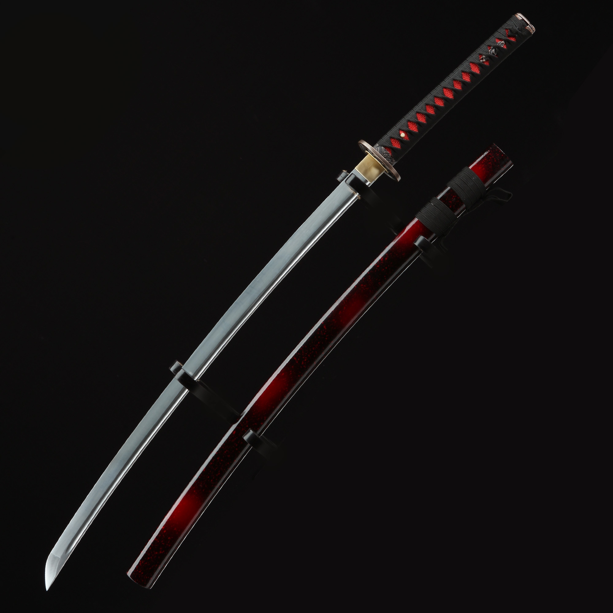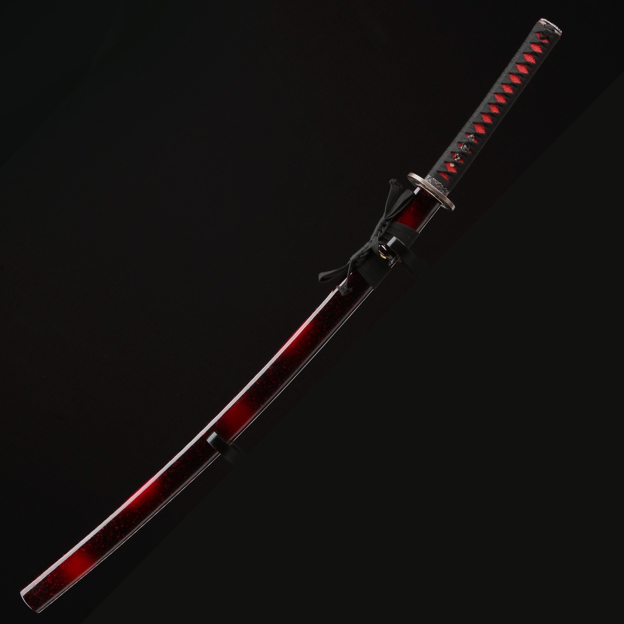 - Red katana, 1045 carbon steel, handmade, full tang, sharpened, blade polished, 40.5 inches, black cord handle, red scabbard, alloy fittings