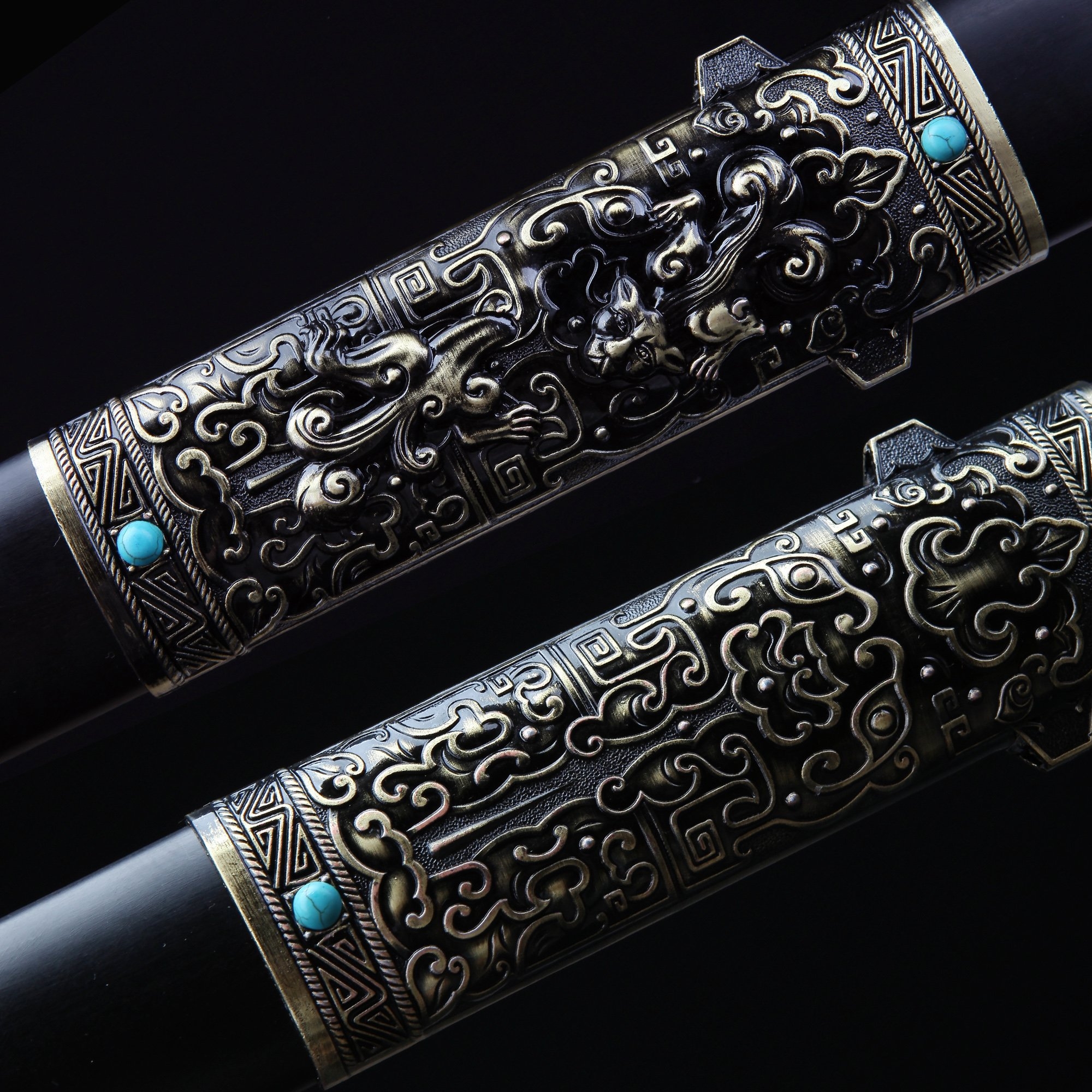 - Key features: han dynasty, real chinese swords, damascus steel, blackwood scabbard, handmade, full tang, hand forged, blade polished, sharpened, double edge sharp, real copper fittings