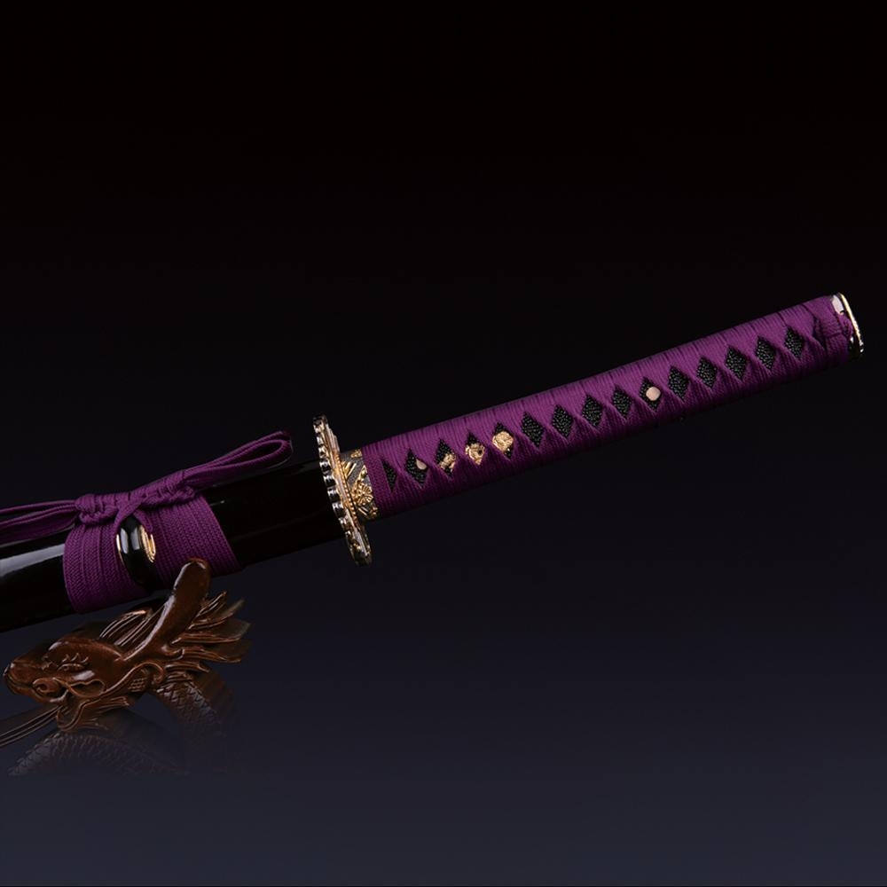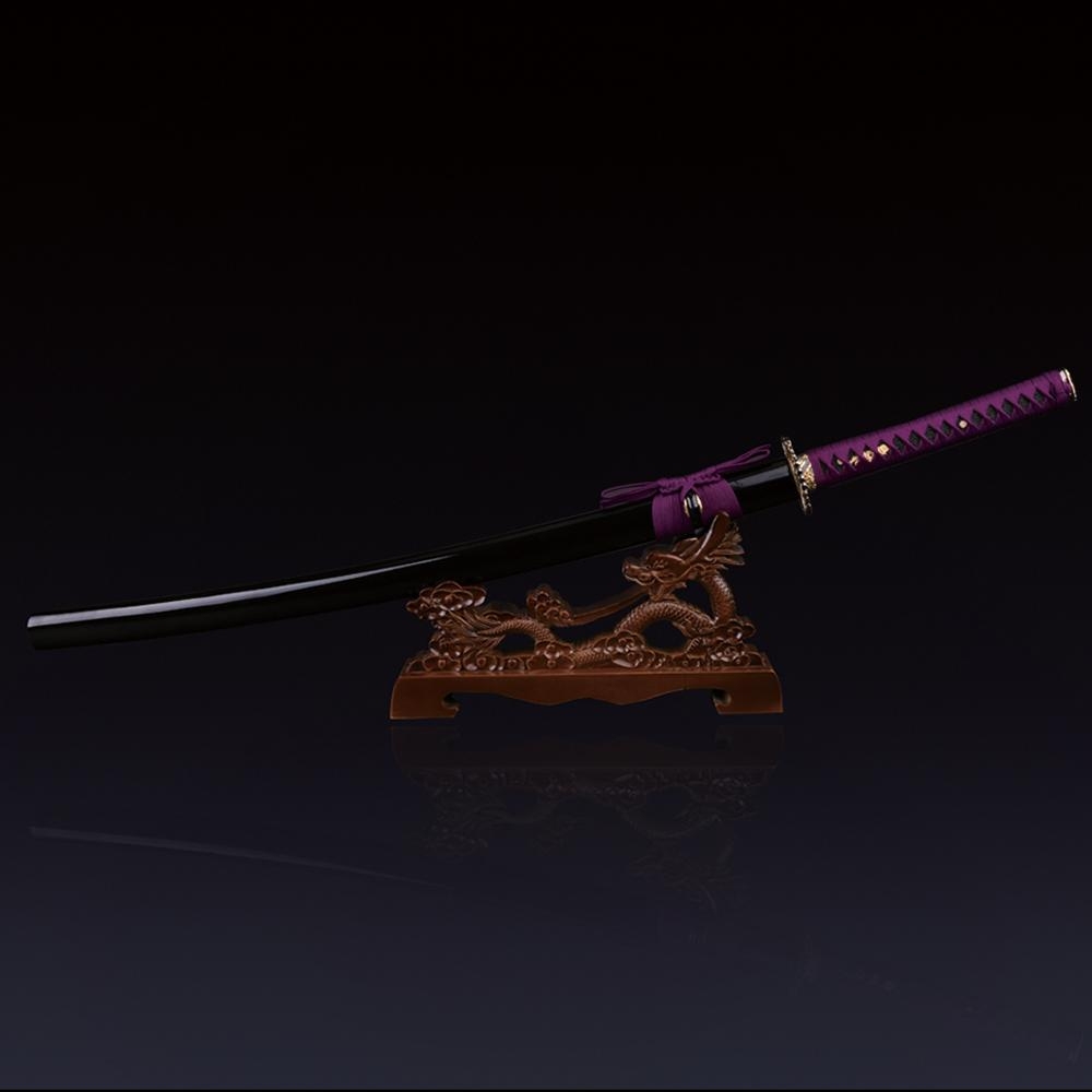 - Key features: katana, 1045 carbon steel, handmade, full tang, battle ready, sharpened, purple cord handle, dual bamboo peg, piano paint scabbard
