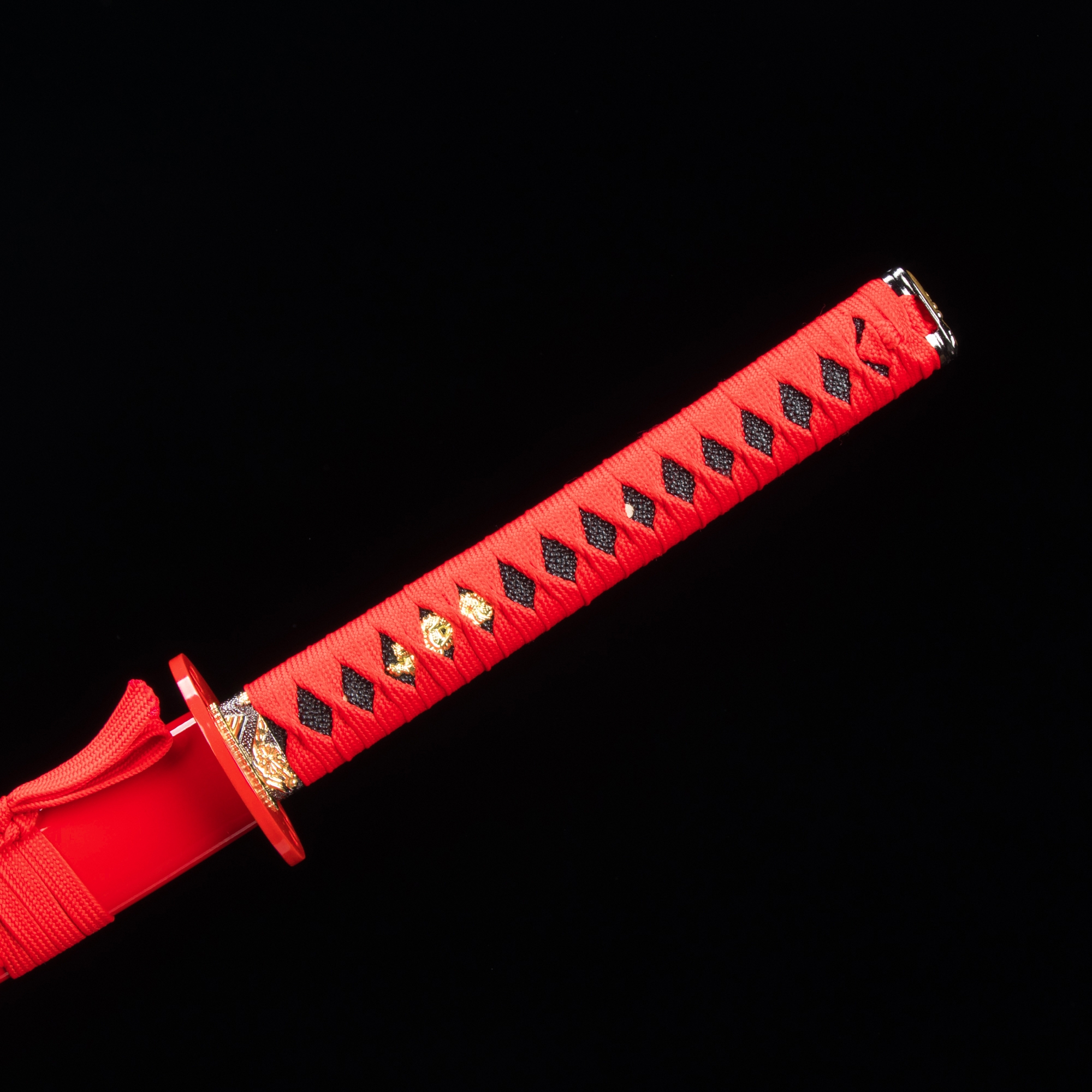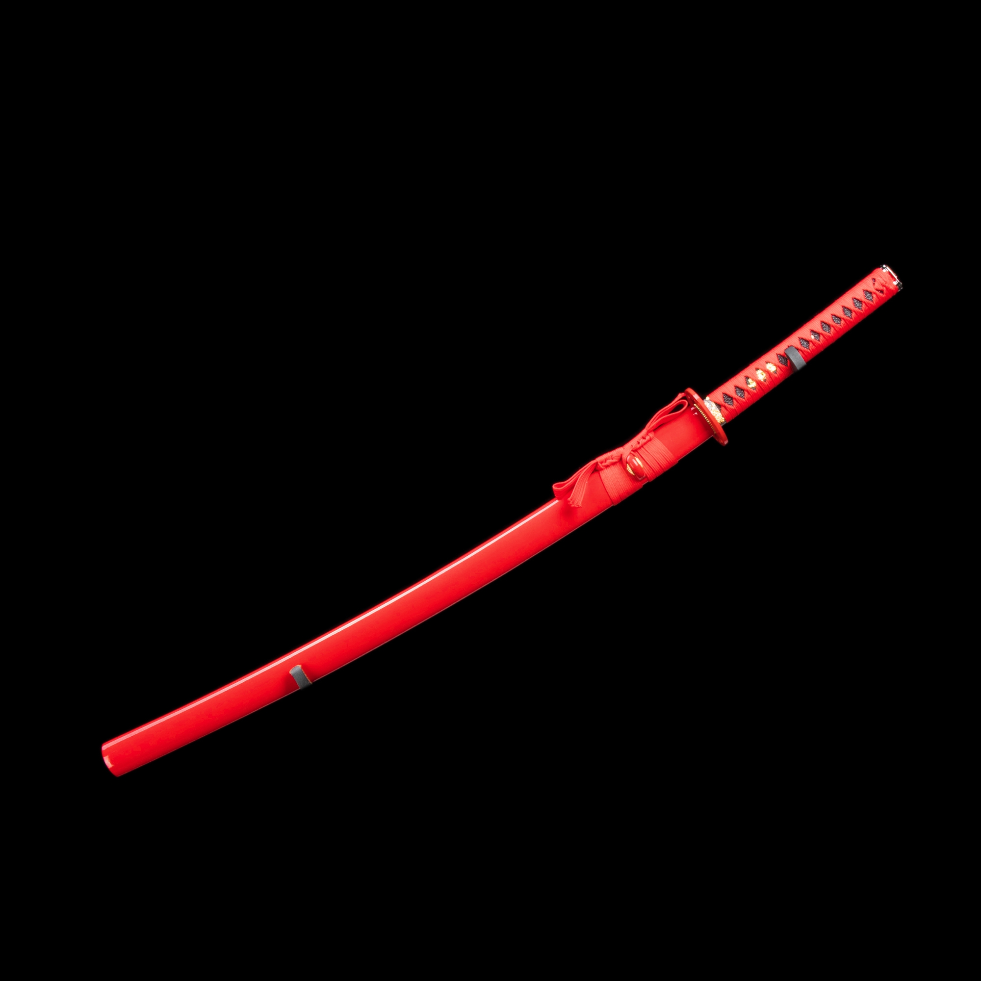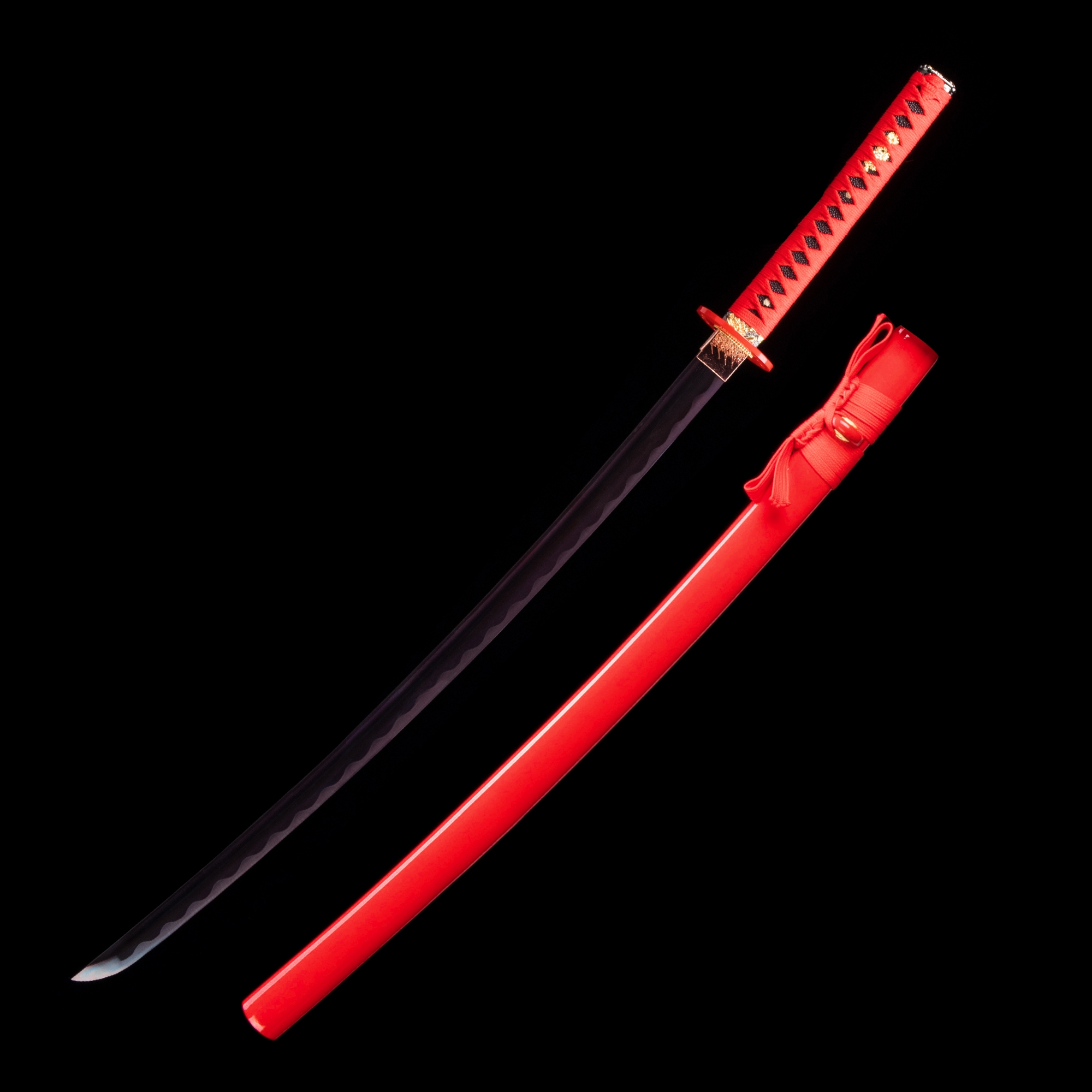 - Katana, red katana, blue blade, 1045 carbon steel, handmade, full tang, battle ready, sharpened, red scabbard, red cord handle, 40.5 inches, alloy fittings