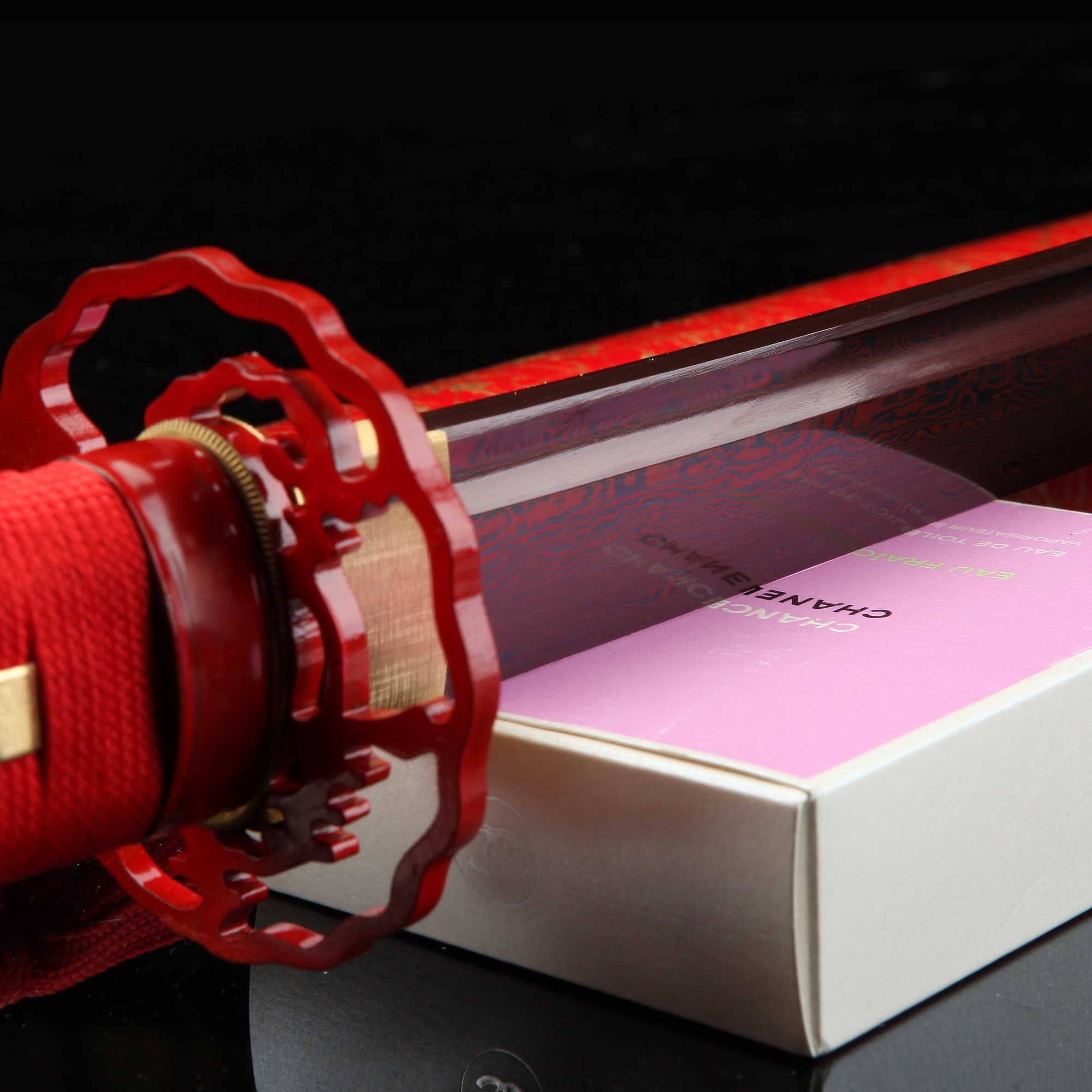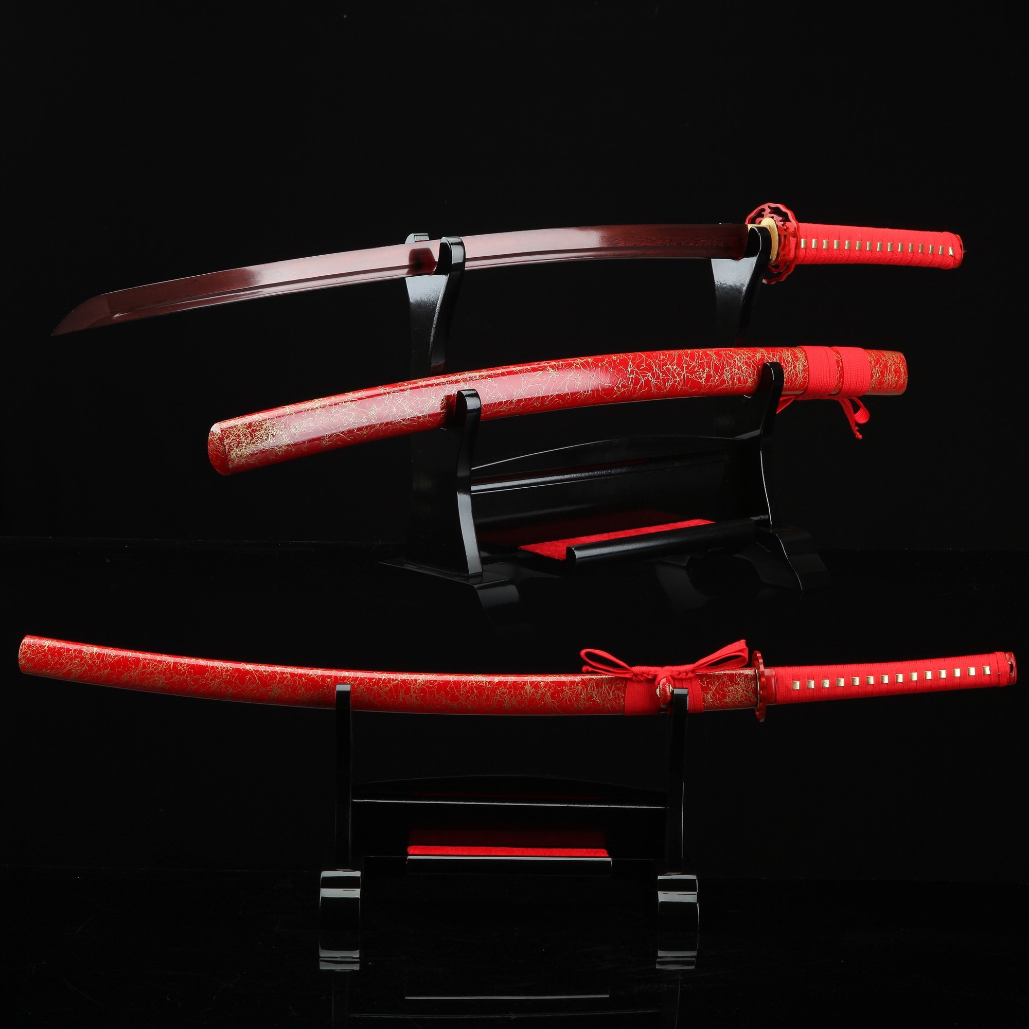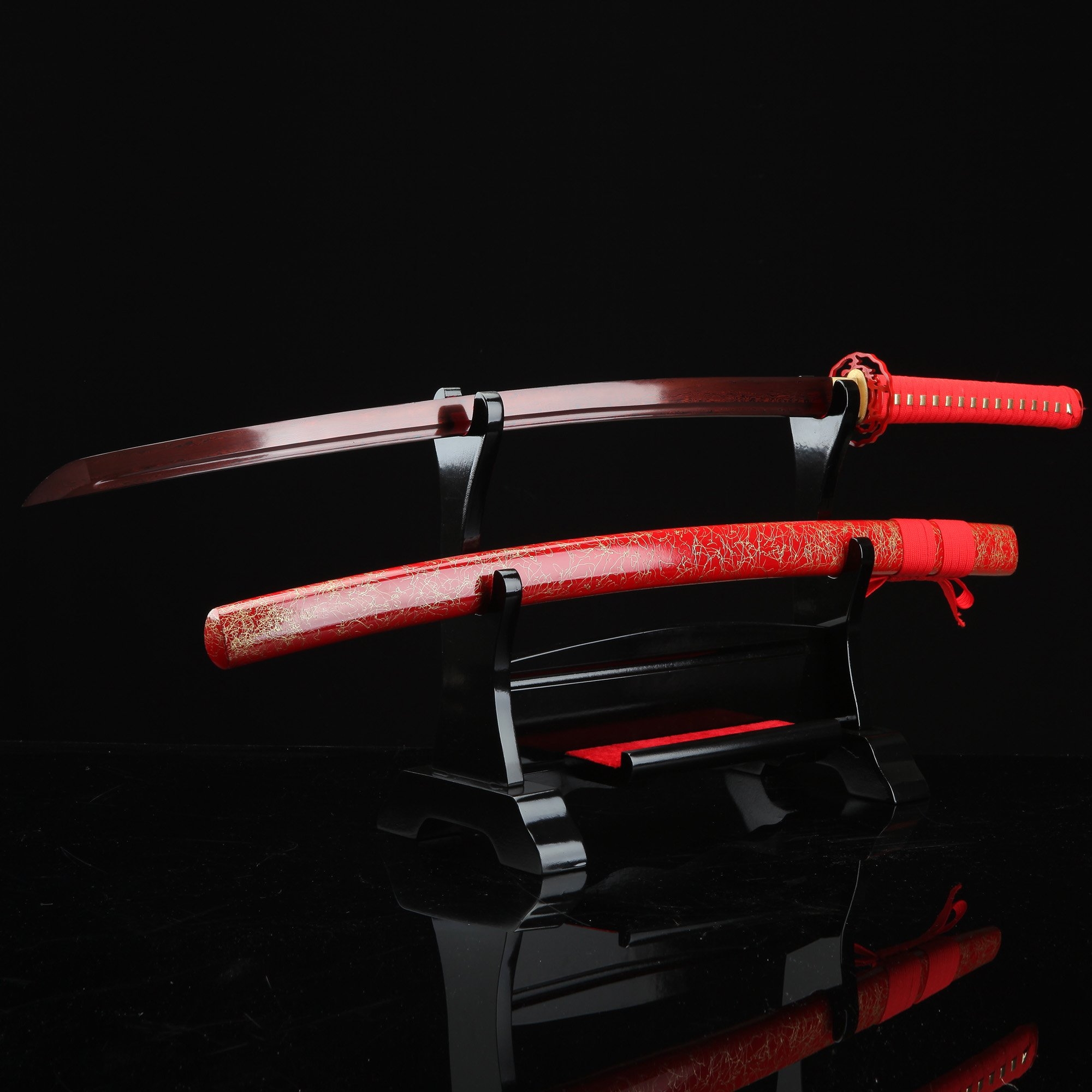 - Katana, red katana, damascus steel, handmade, full tang, battle ready, blade polished, sharpened, alloy fittings, 40.5 inches, piano paint scabbard, red scabbard