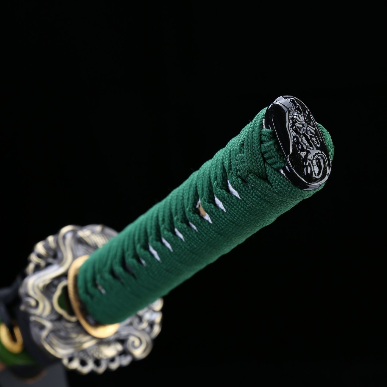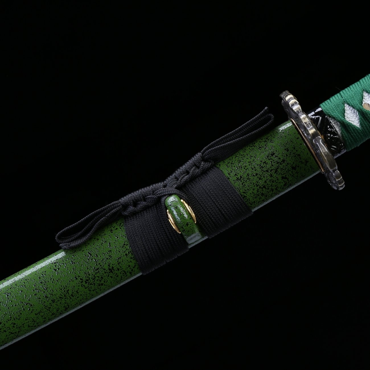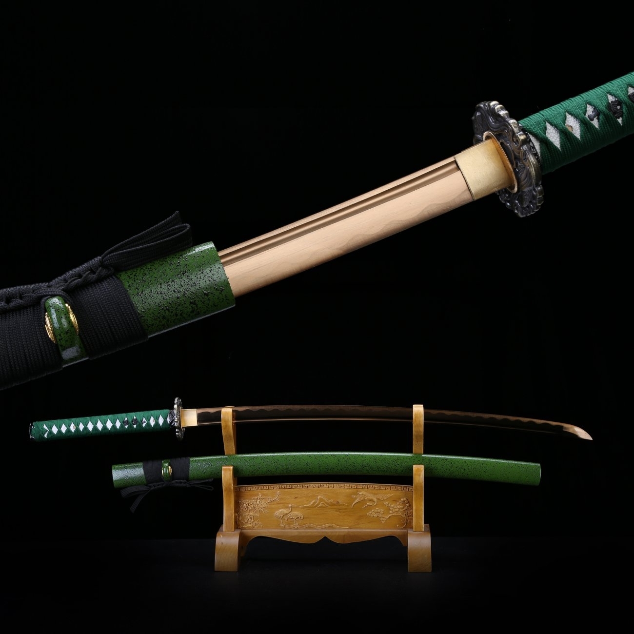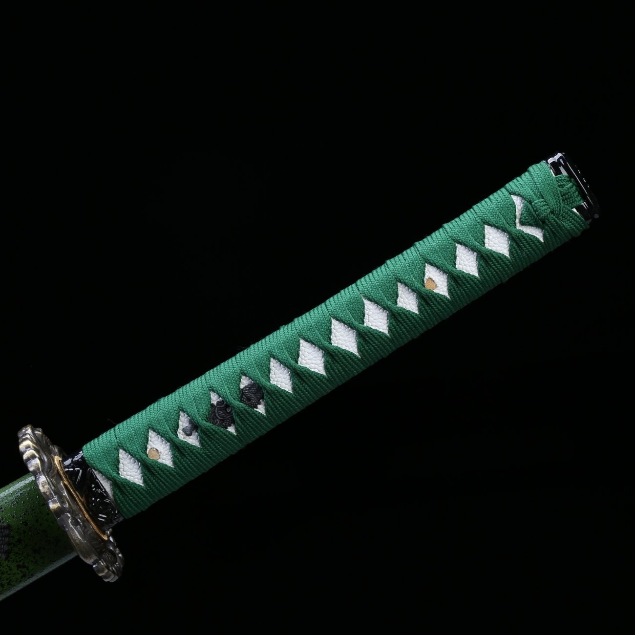 - Red ray skin, green cotton cord wrapped handle, green hand lacquered hardwood scabbard