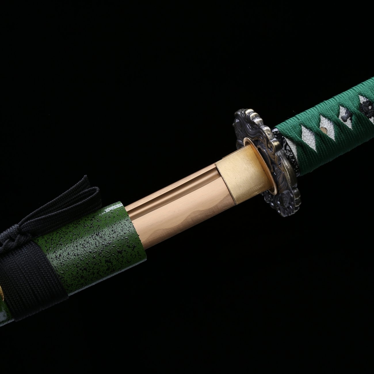 - Katana, full tang, handmade, 1045 carbon steel, battle ready, sharpened, blade polished, alloy fittings, green cord handle, 28 inches blade, 40.5 inches, gold blade
