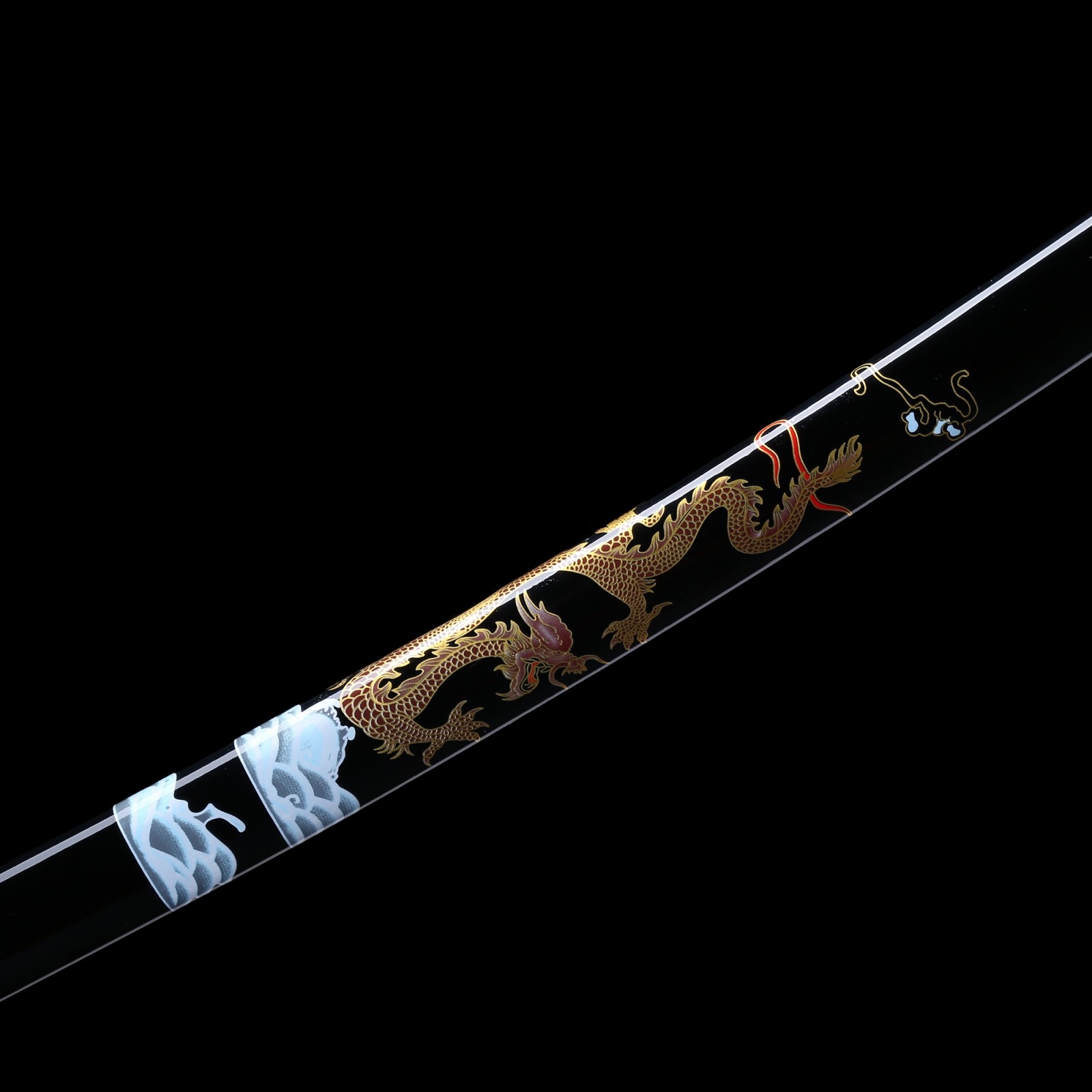 - Black dragon theme lacquered hard wood saya, premium alloy fittings, ray skin, cotton cord wrapped handle