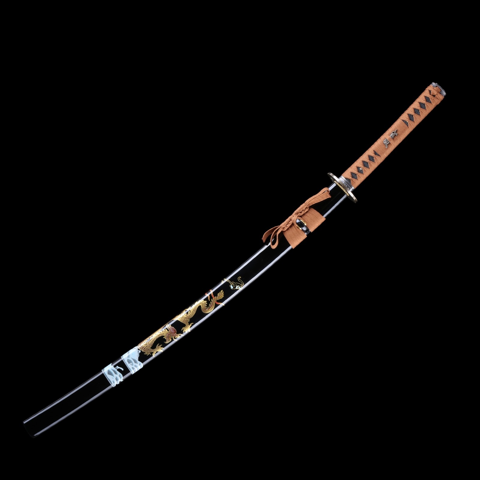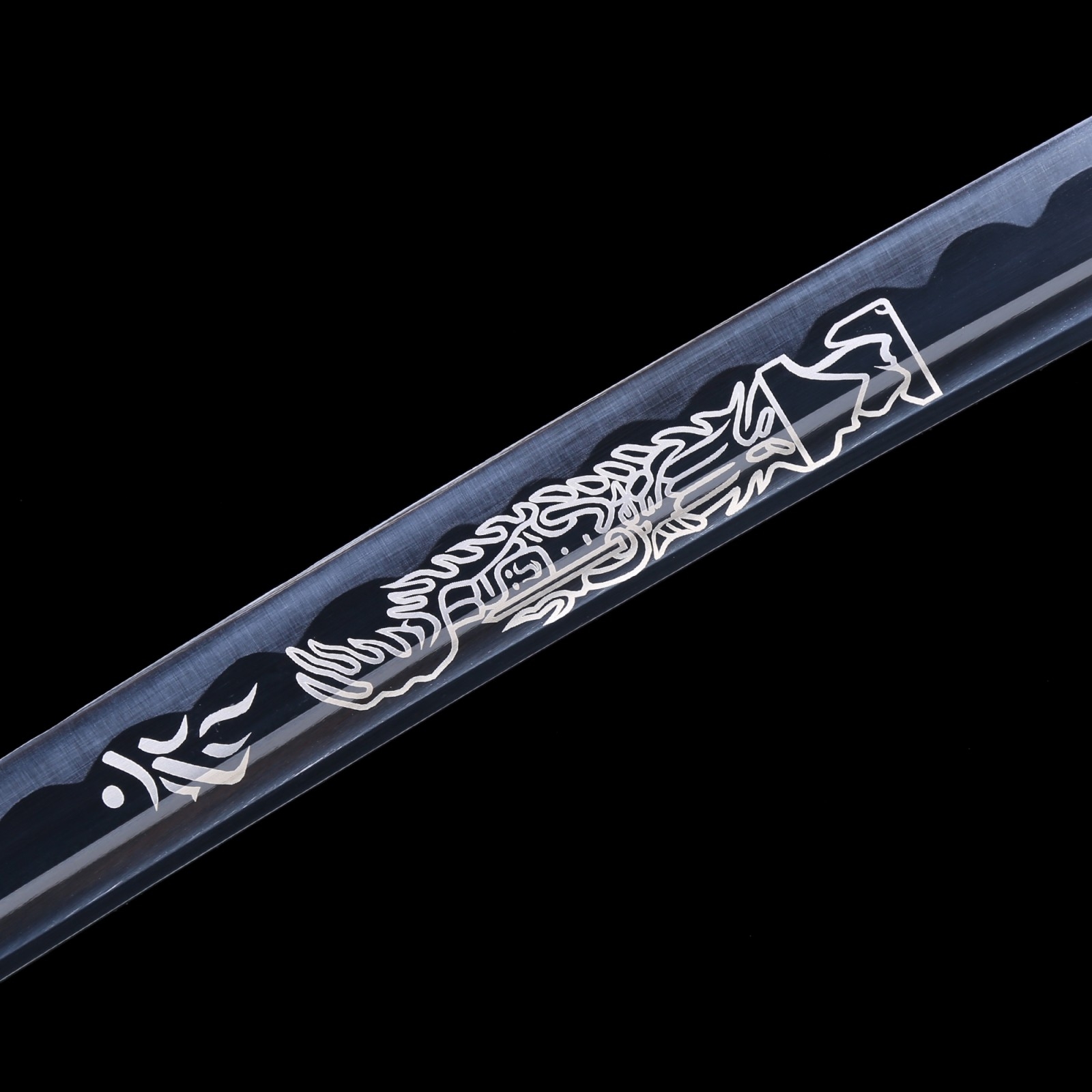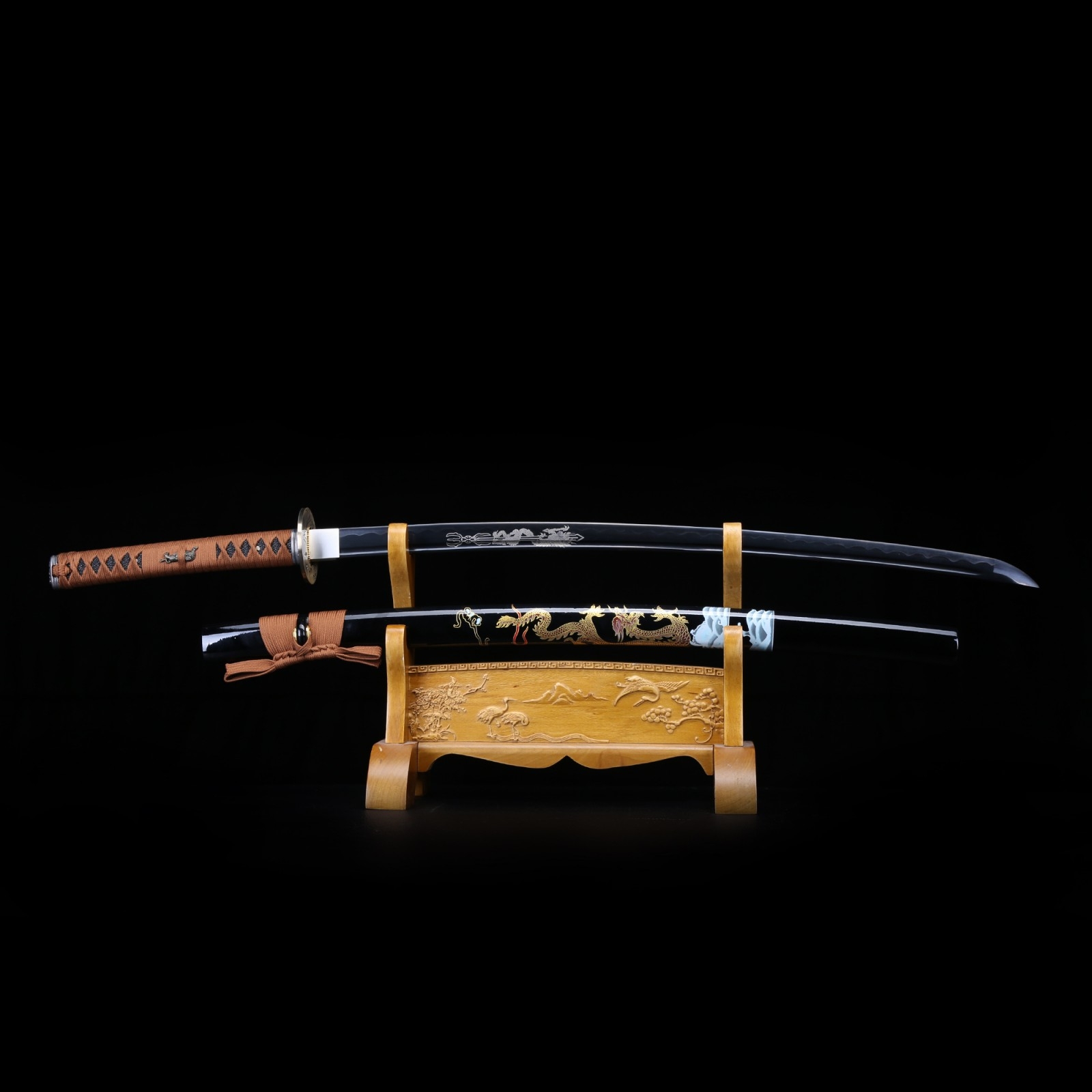 - Key features: black katana, blade carving, black blade, 1060 carbon steel, full tang, handmade, battle ready, sharpened, balck scabbard, alloy fittings