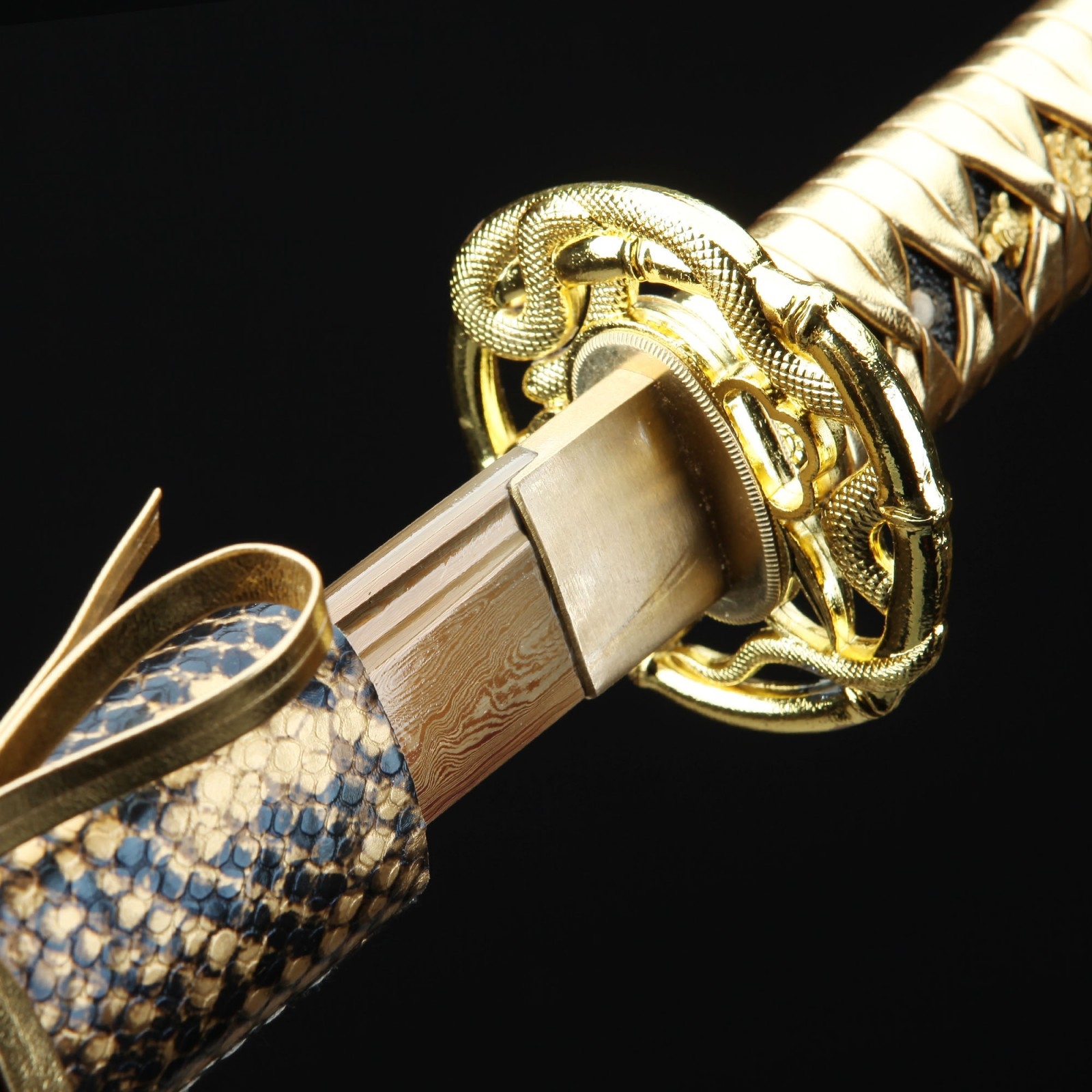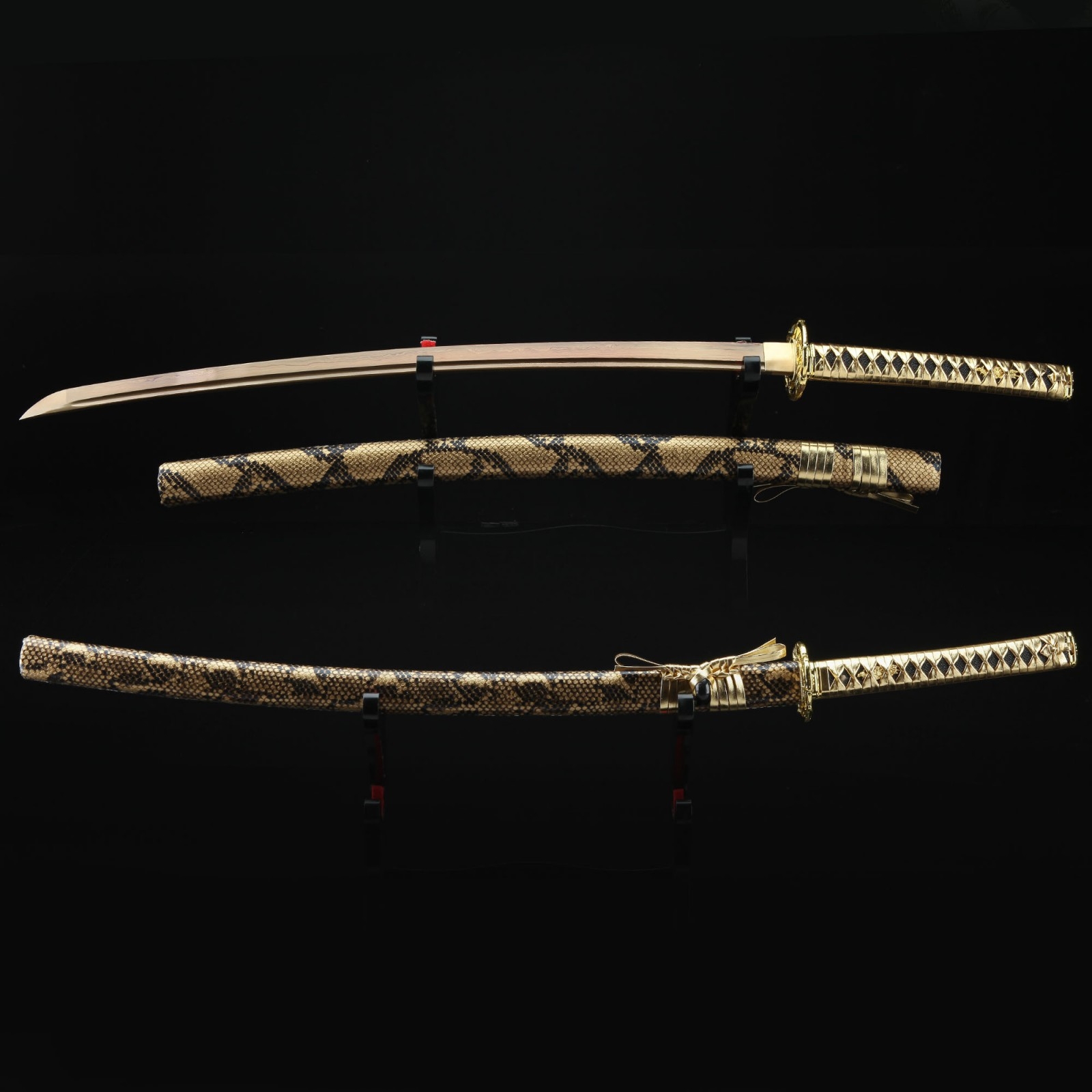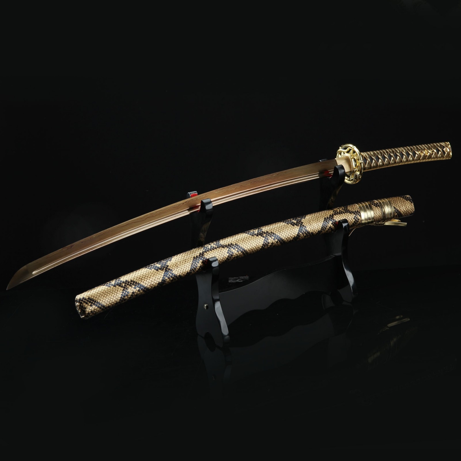 - Key features: katana, damascus steel, gold blade, handmade, full tang, sharpened, battle ready, leather scabbard, gold saya, alloy fittings