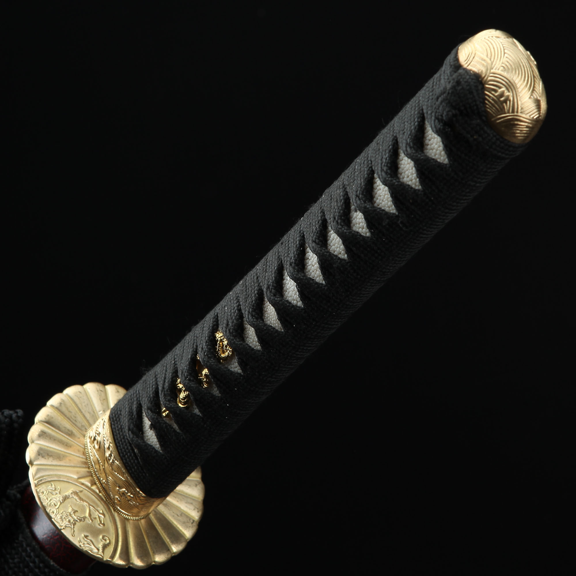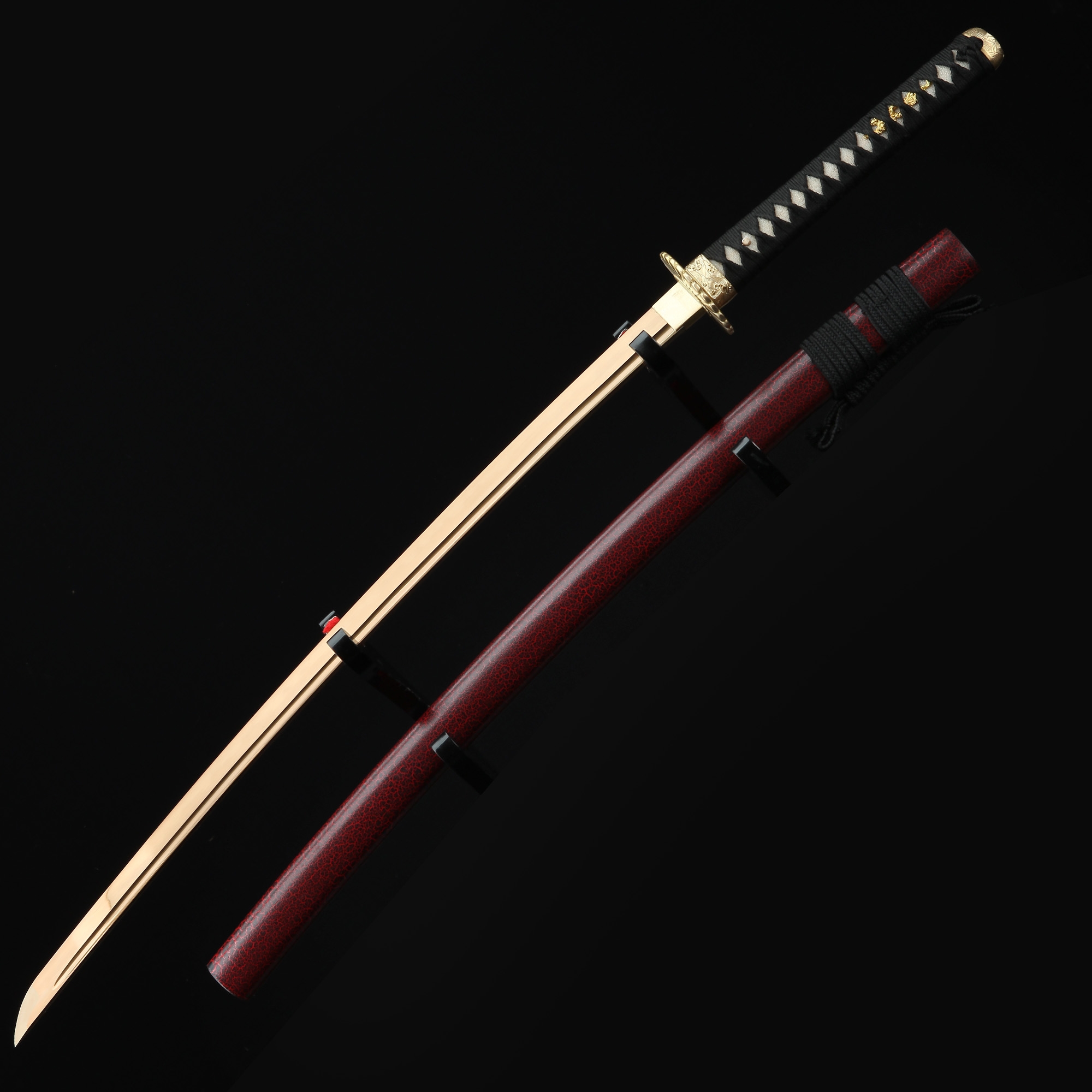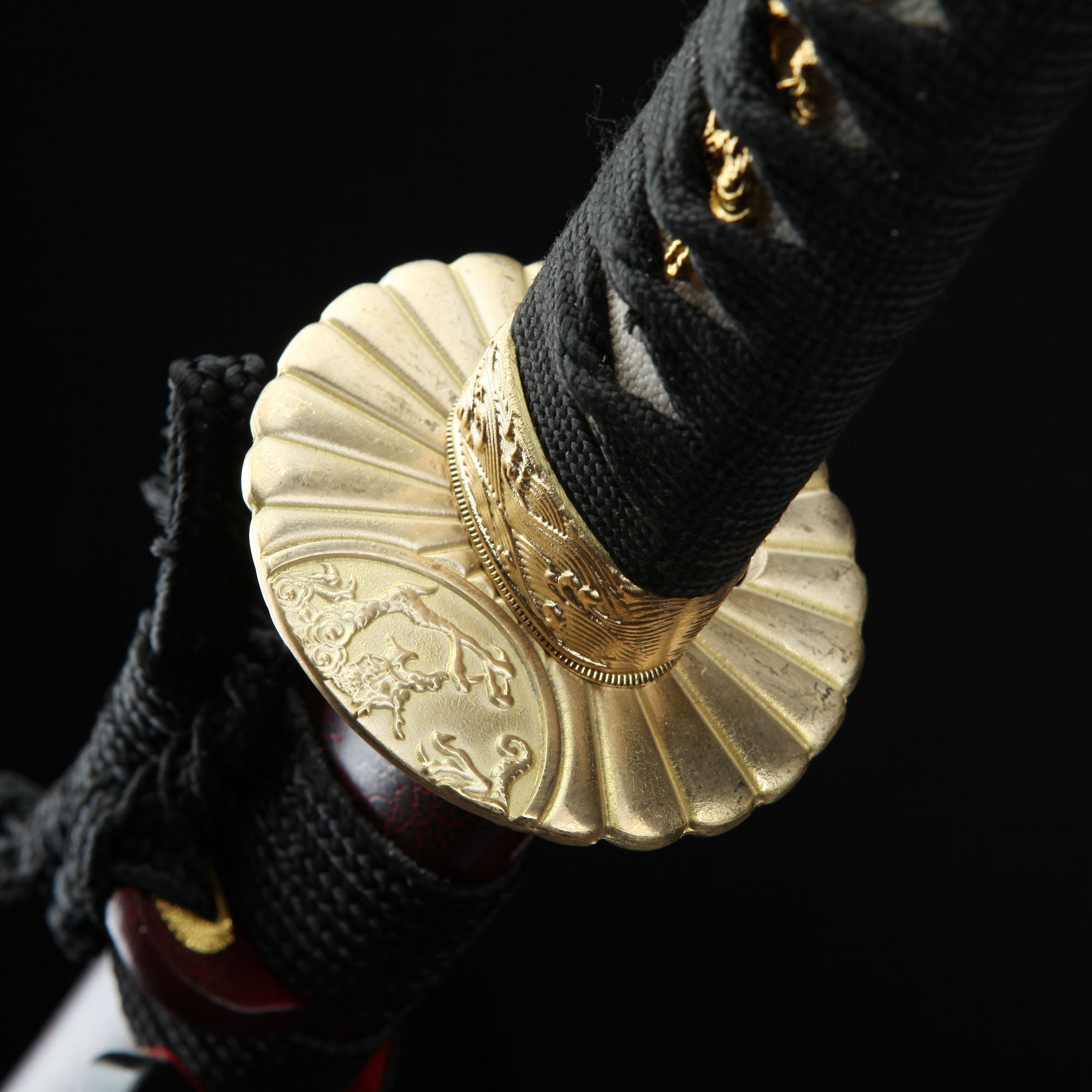 - Key features: katana, t10 carbon steel, gold blade, handmade, full tang, hand forged, sharpened, battle ready, red saya, alloy fittings, black cord handle