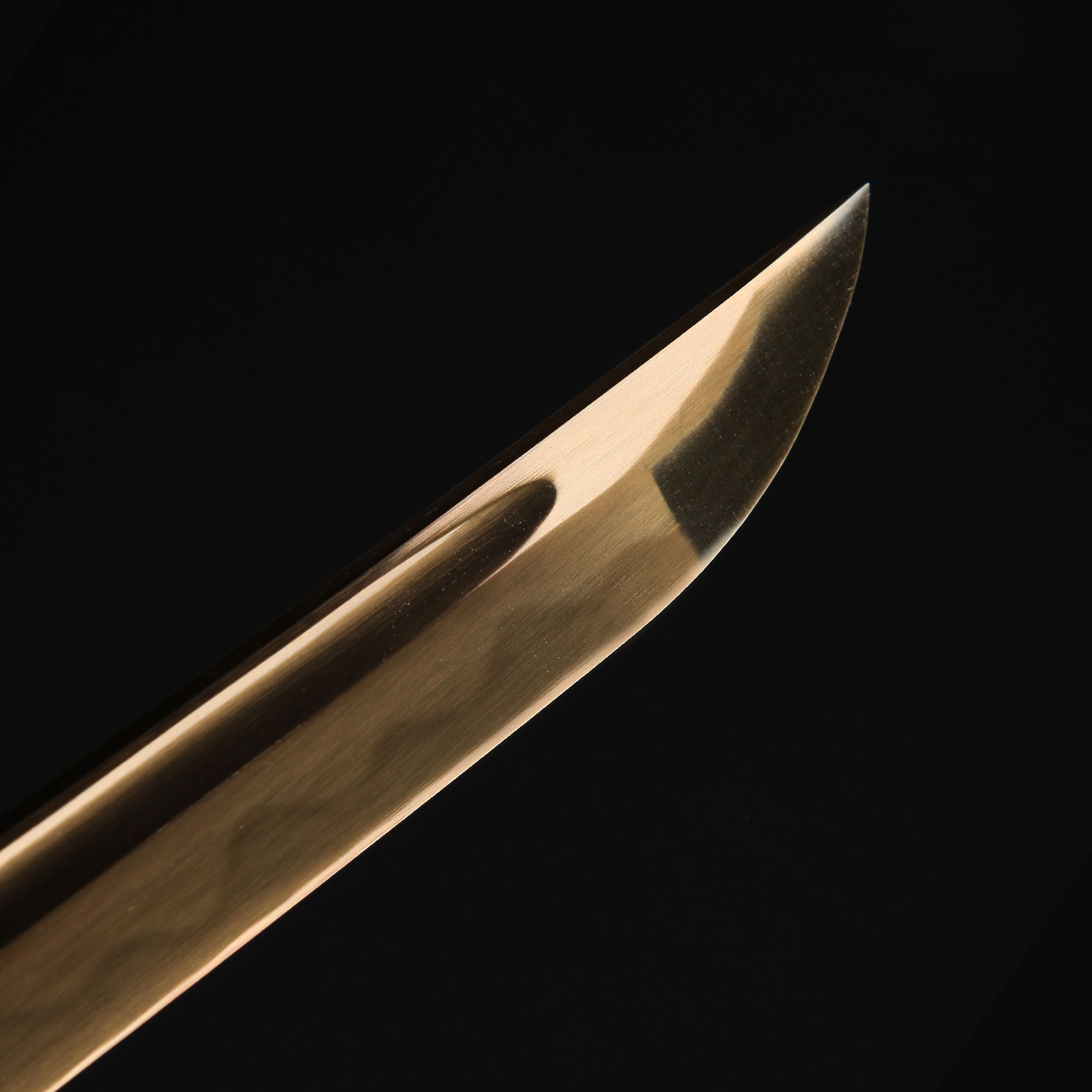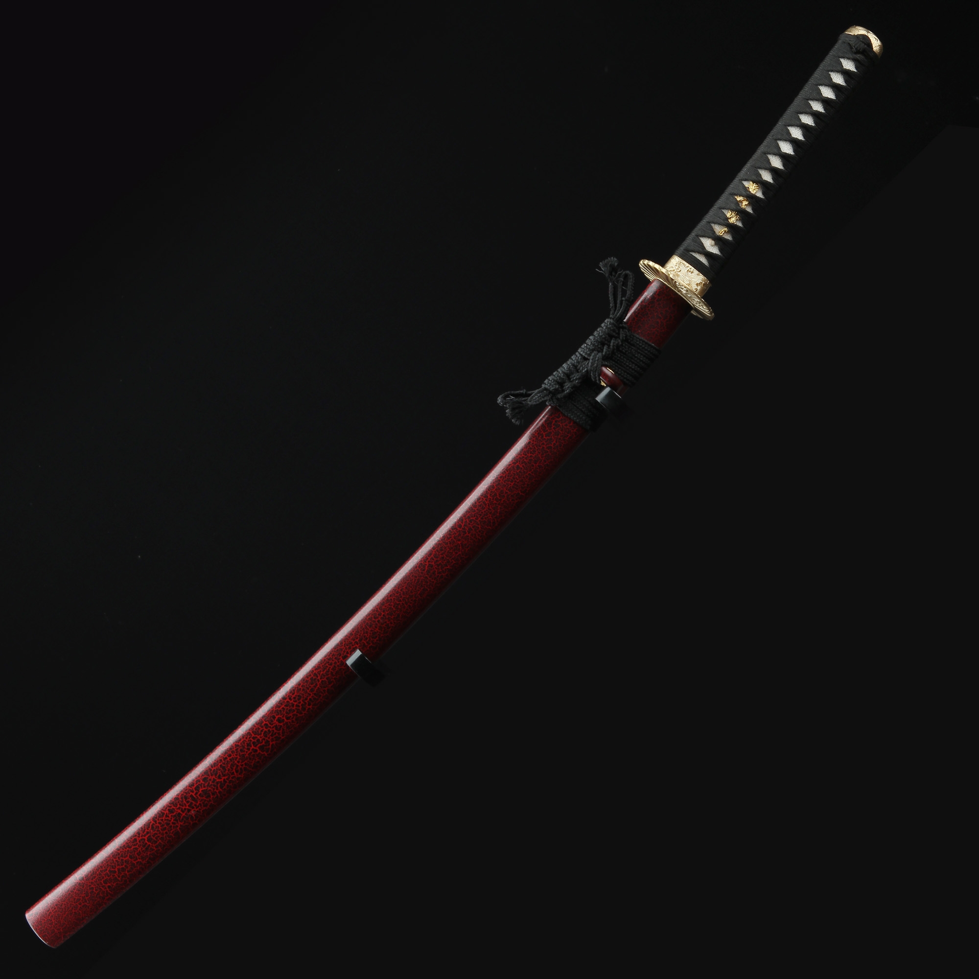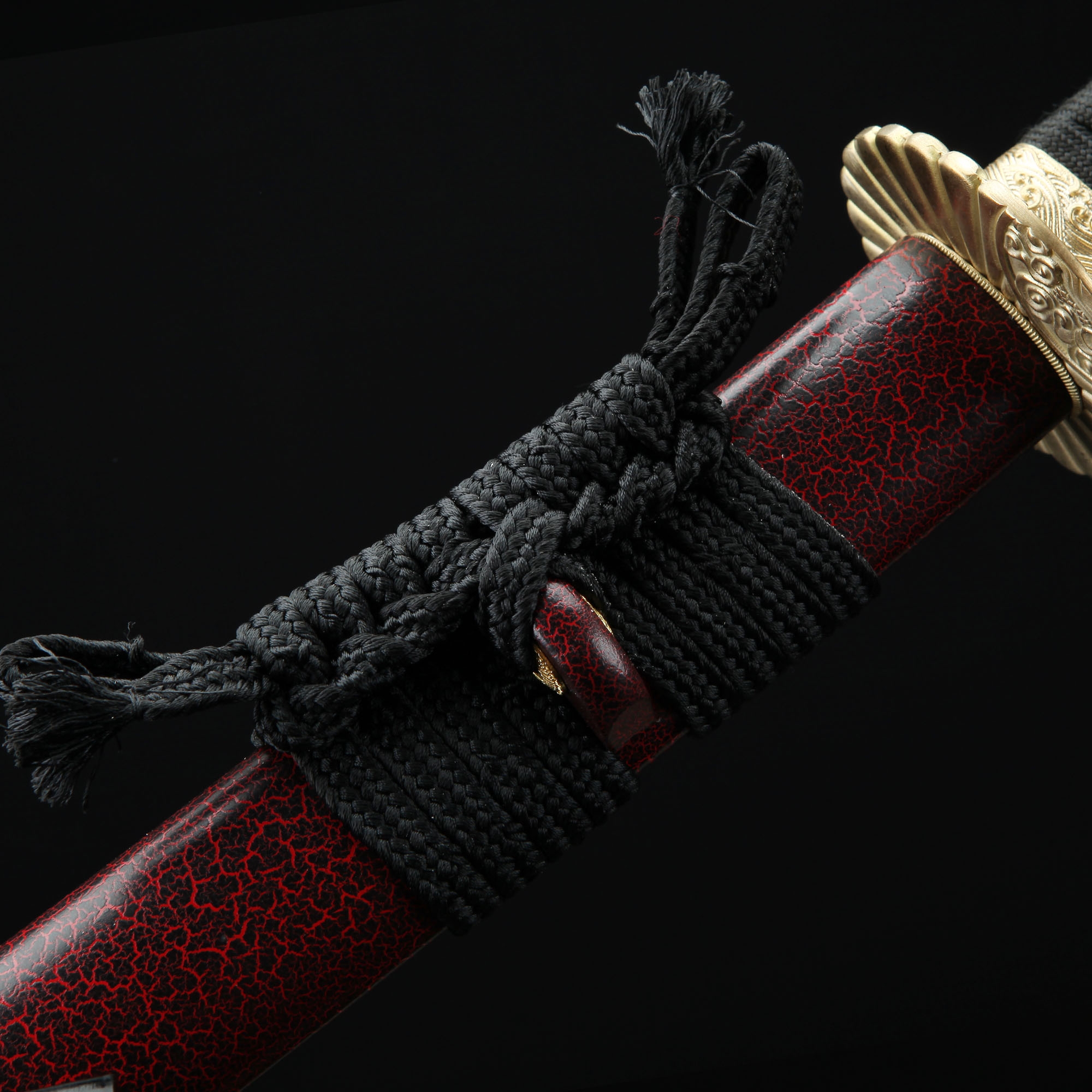 - Key features: katana, t10 carbon steel, gold blade, handmade, full tang, hand forged, sharpened, battle ready, red saya, alloy fittings, black cord handle