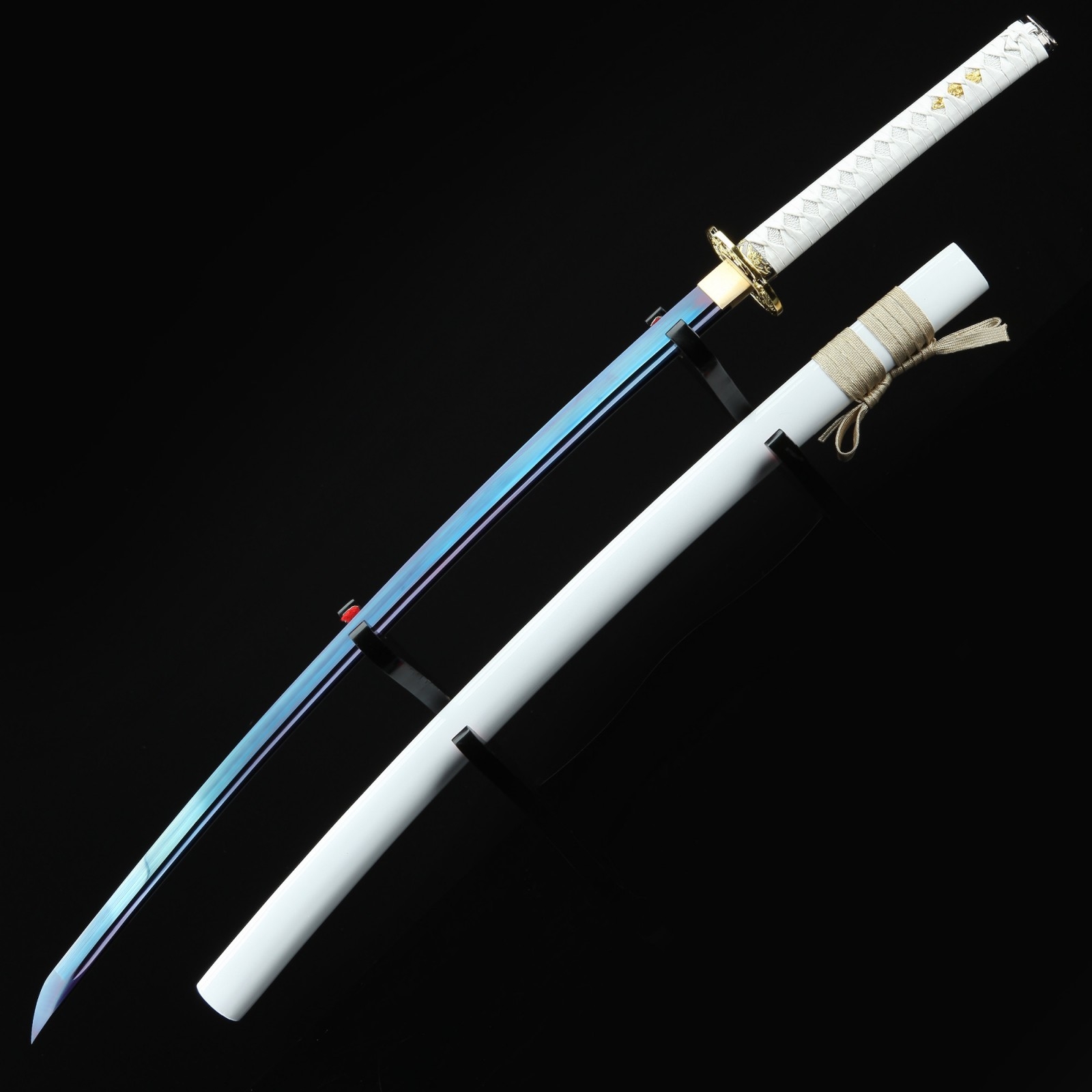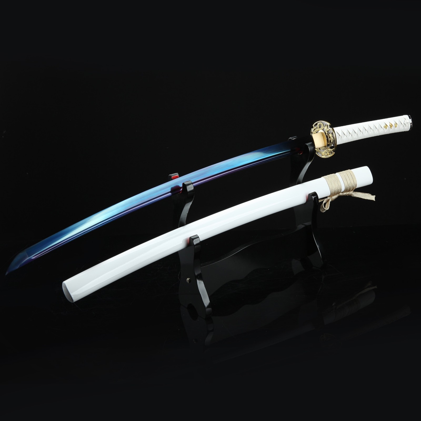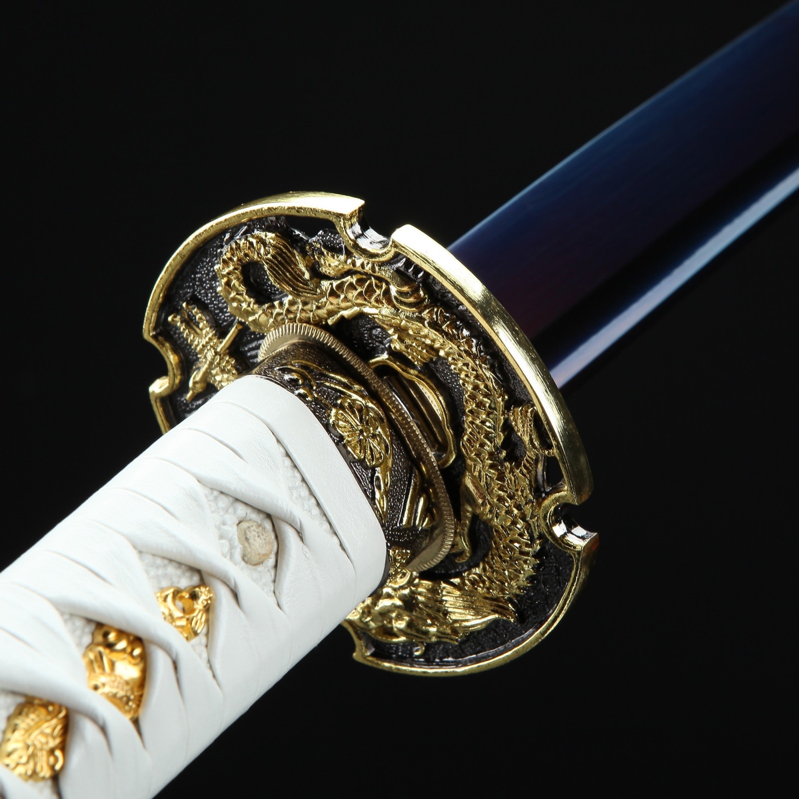 - Key features: 1045 carbon steel, dragon tsuba, blue blade, white saya, handmade, full tang, blade polished, sharpened, battle ready, white cord handle, alloy fittings