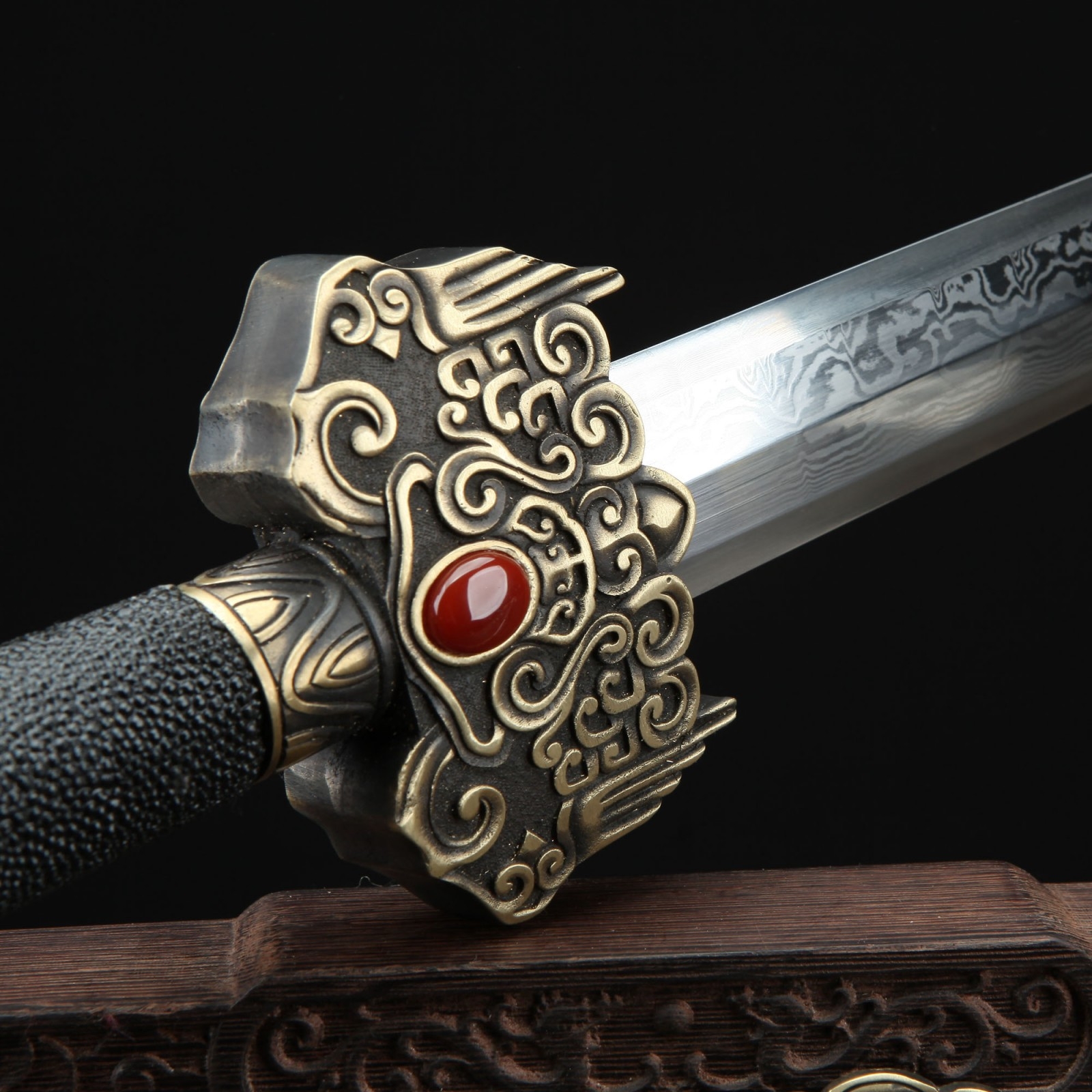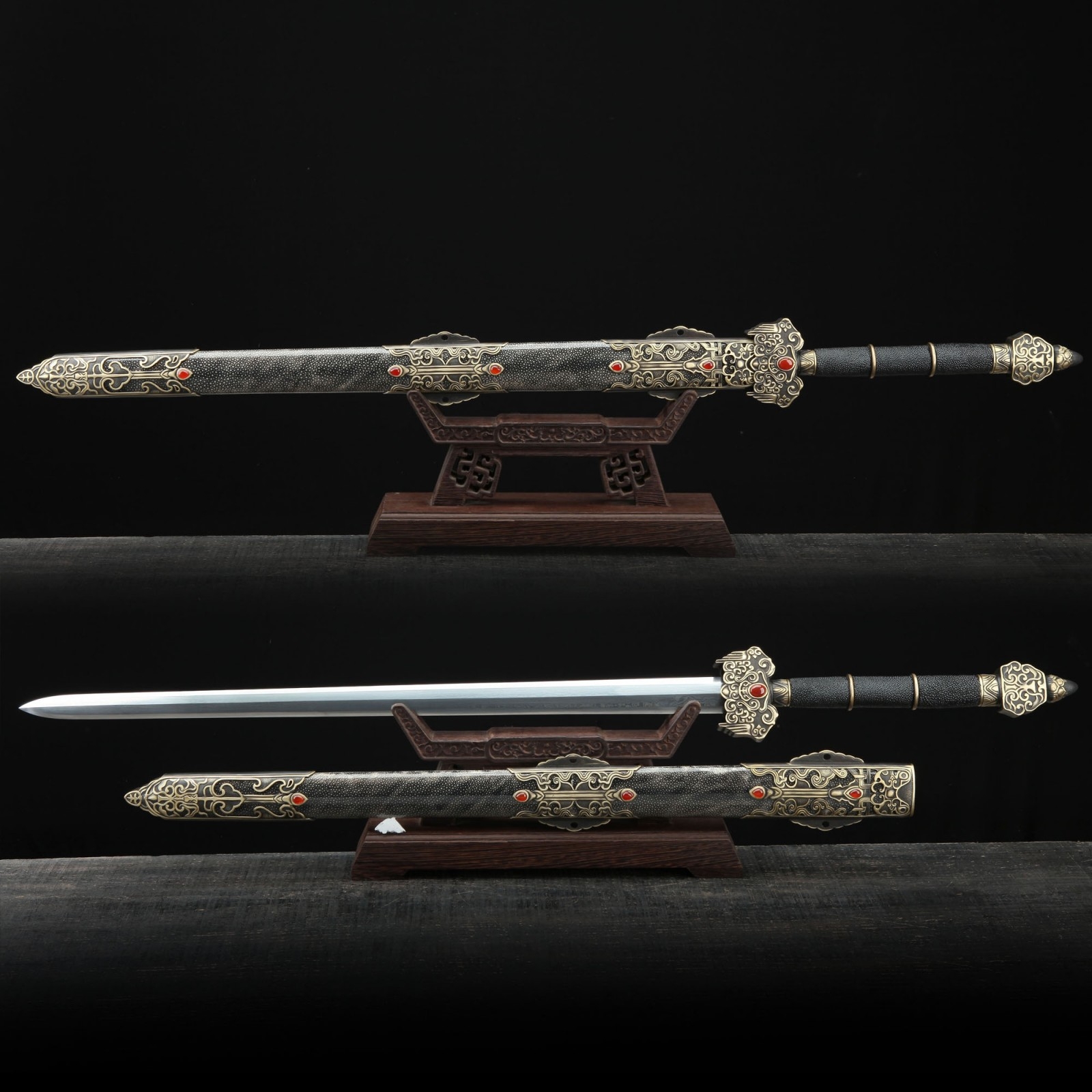 - Key features: real chinese swords, damascus steel, handmade, full tang, sharpened, double edge sharp, real rayskin scabbard, premium gold printed fittings, gemstone fittings