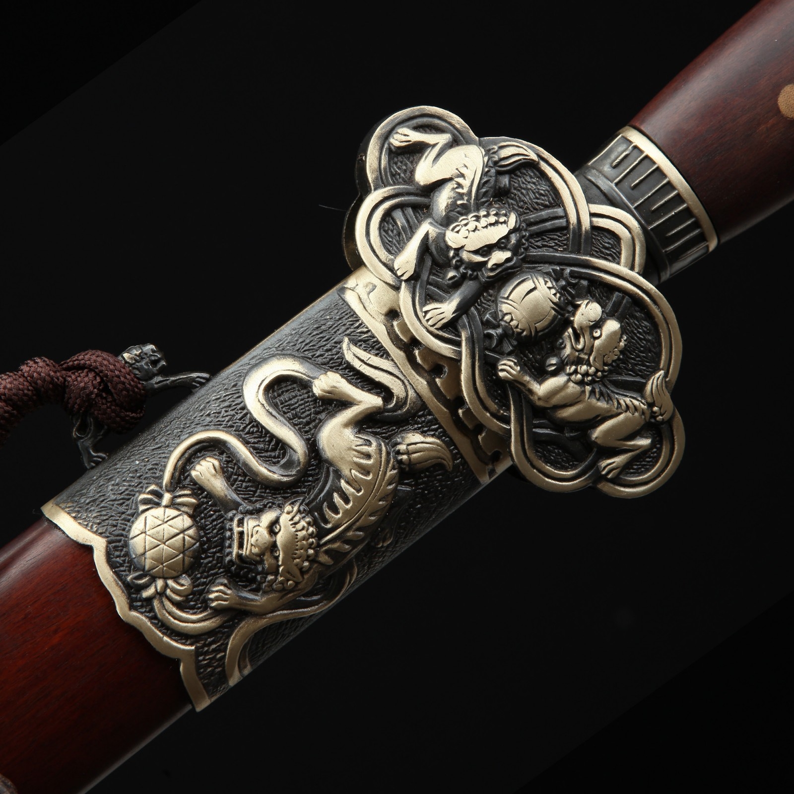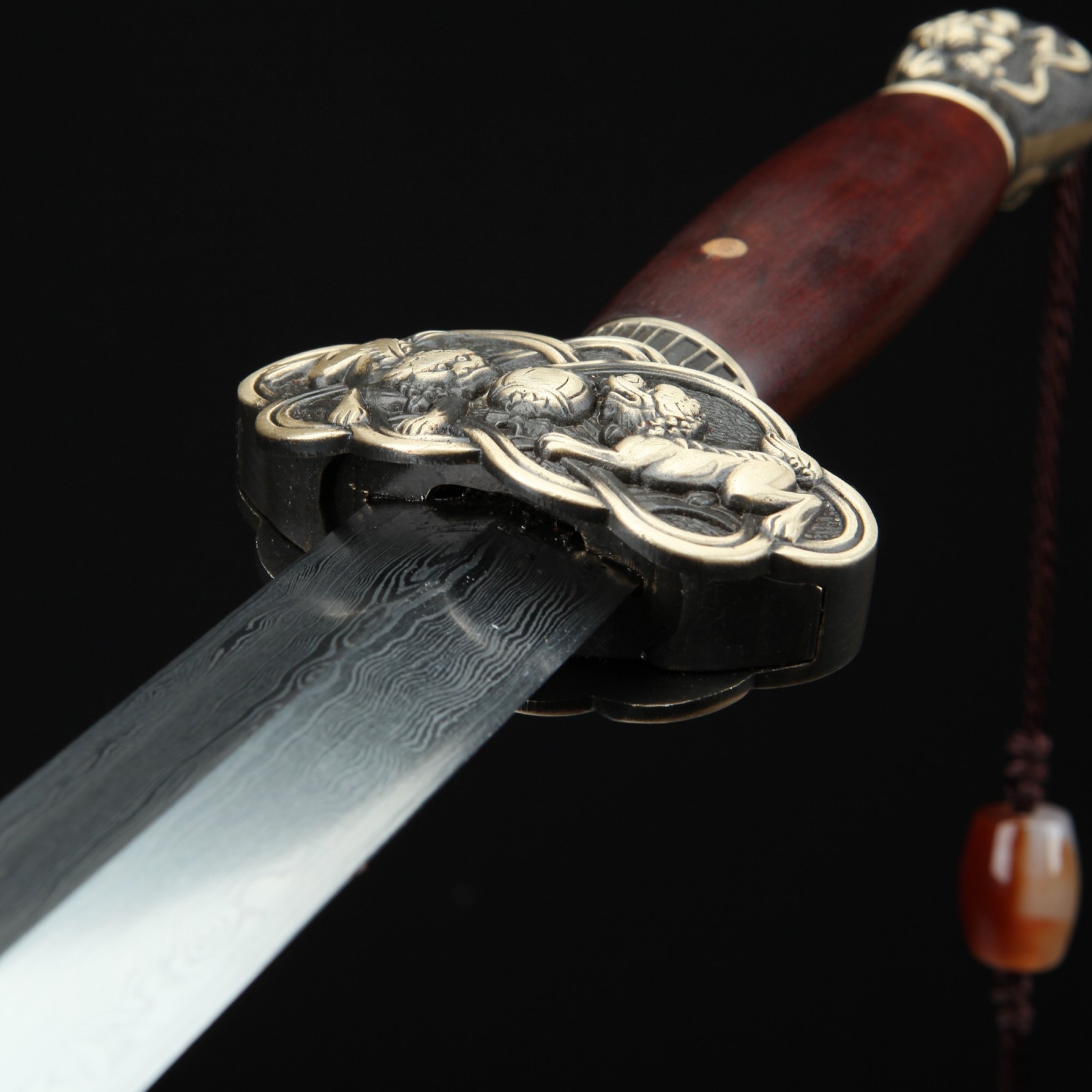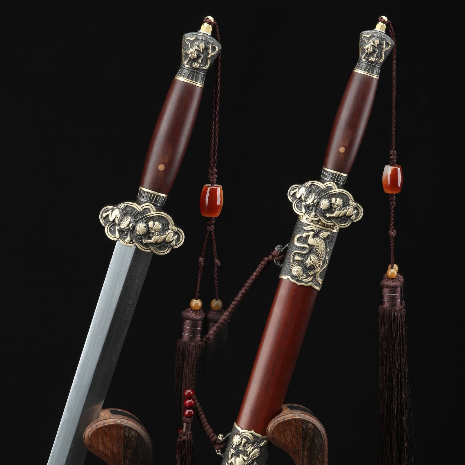 - Key features: qing dynasty, real chinese swords, damascus steel, rosewood scabbard, full tang, handmade, blade polished, sharpened, double edge sharp, copper fittings